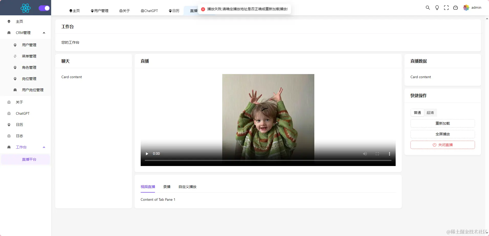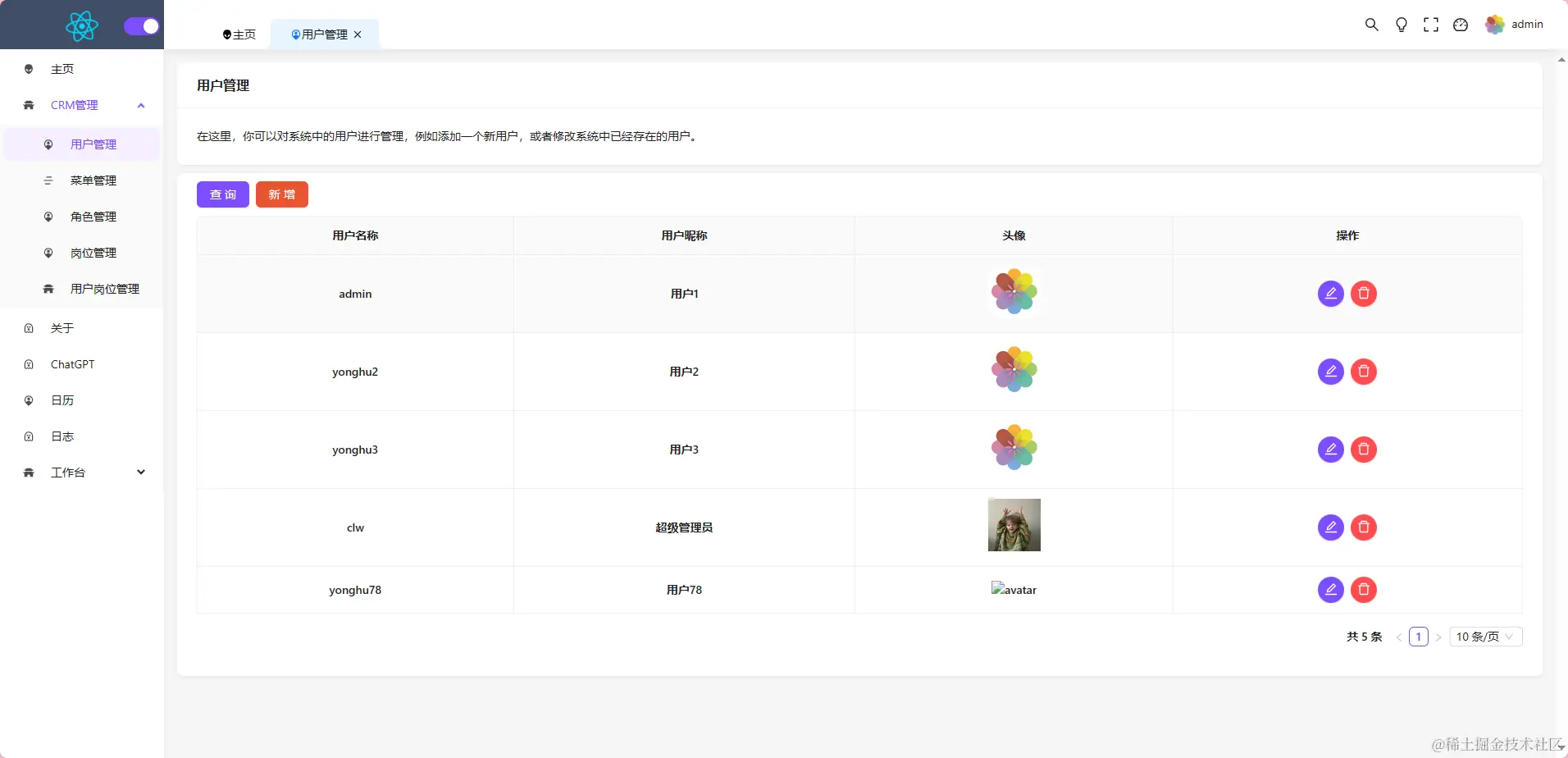 这是一个基于React18并使用Vite4.0构建的管理端项目。它实现了动态路由,标准的RBAC权限模型和多角色多岗位权限模型,包括登录鉴权,菜单管理等功能。