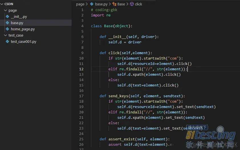 我们在base类里面,将一些通用的方法,进行封装。如图举例,就是一个对元素点击事件和输入内容操作的封装,将resourceId,xpath,text等三种元素定位的点击和输入内容方式,封装到click和send_keys。以及一个断言元素是否存在的方法。