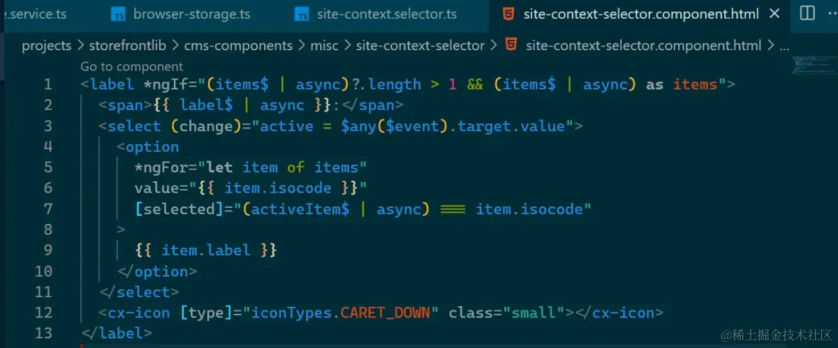 下拉菜单的实现位于 site-context-selector.component.html 文件内部。当用户切换下拉菜单值的时候,触发第 3 行 select 元素的 change 事件。