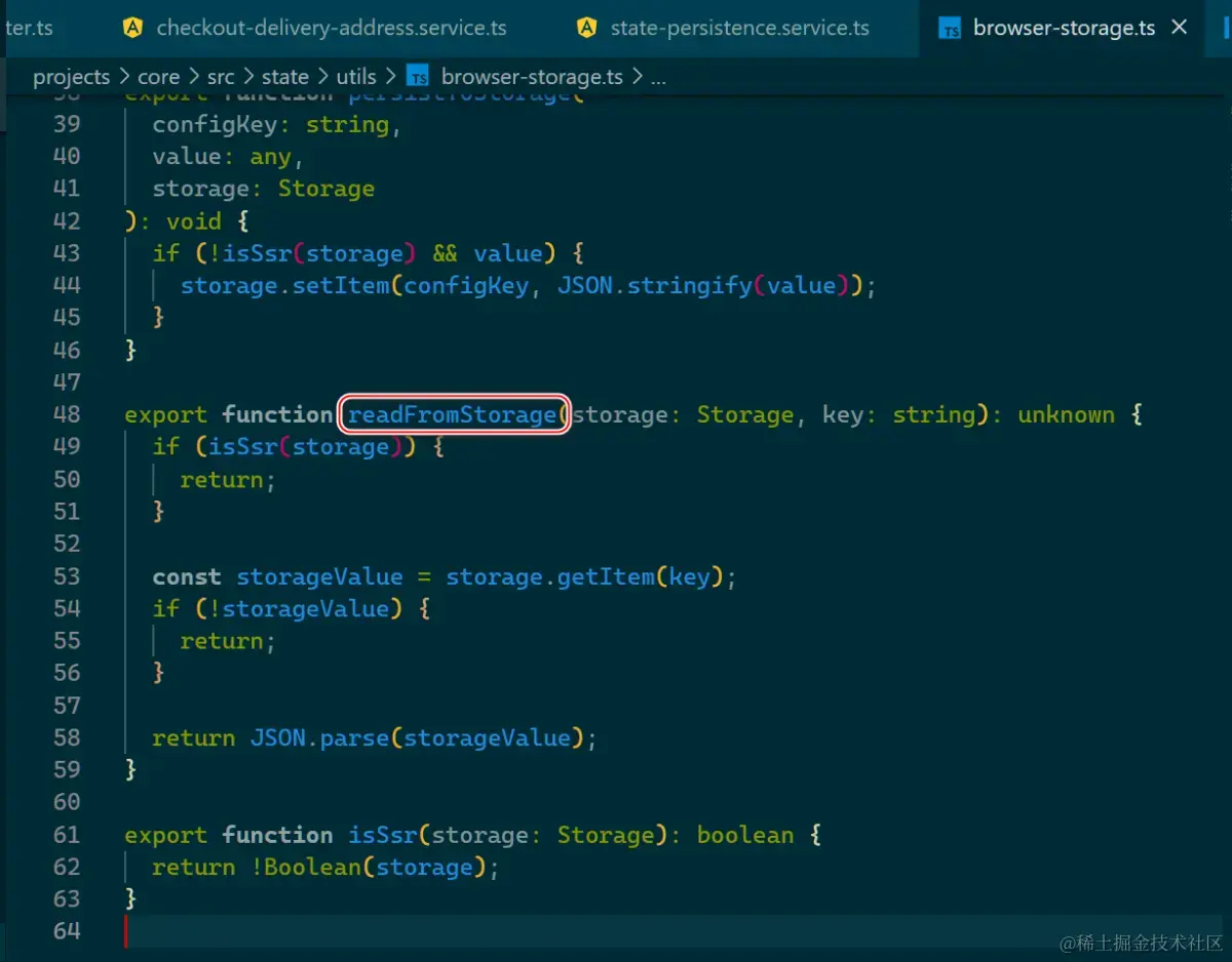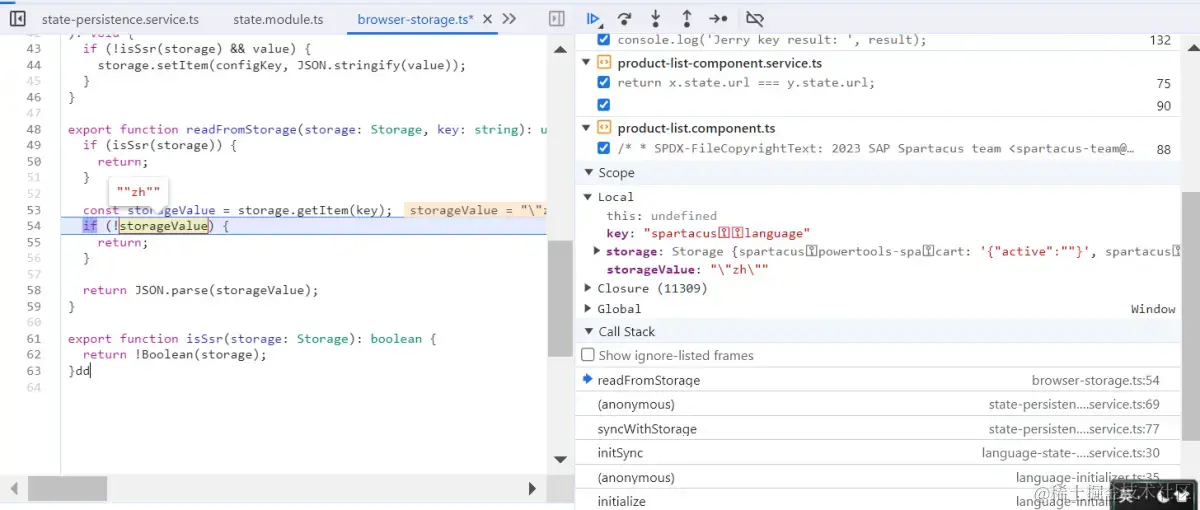逻辑很直接,首先判断是否是在 SSR 环境下,如果是就直接返回。因为按照笔者这篇文章的介绍,用户的个性化设置和私有数据页面,比如购物车,WishList 等,不应该被 Angular 服务器端渲染考虑,所以我们代码里如果 isSsr 检测函数返回 true,直接返回;否则调用 storage 的 API 即 getItem 返回浏览器 LocalStorage 里的存储值。