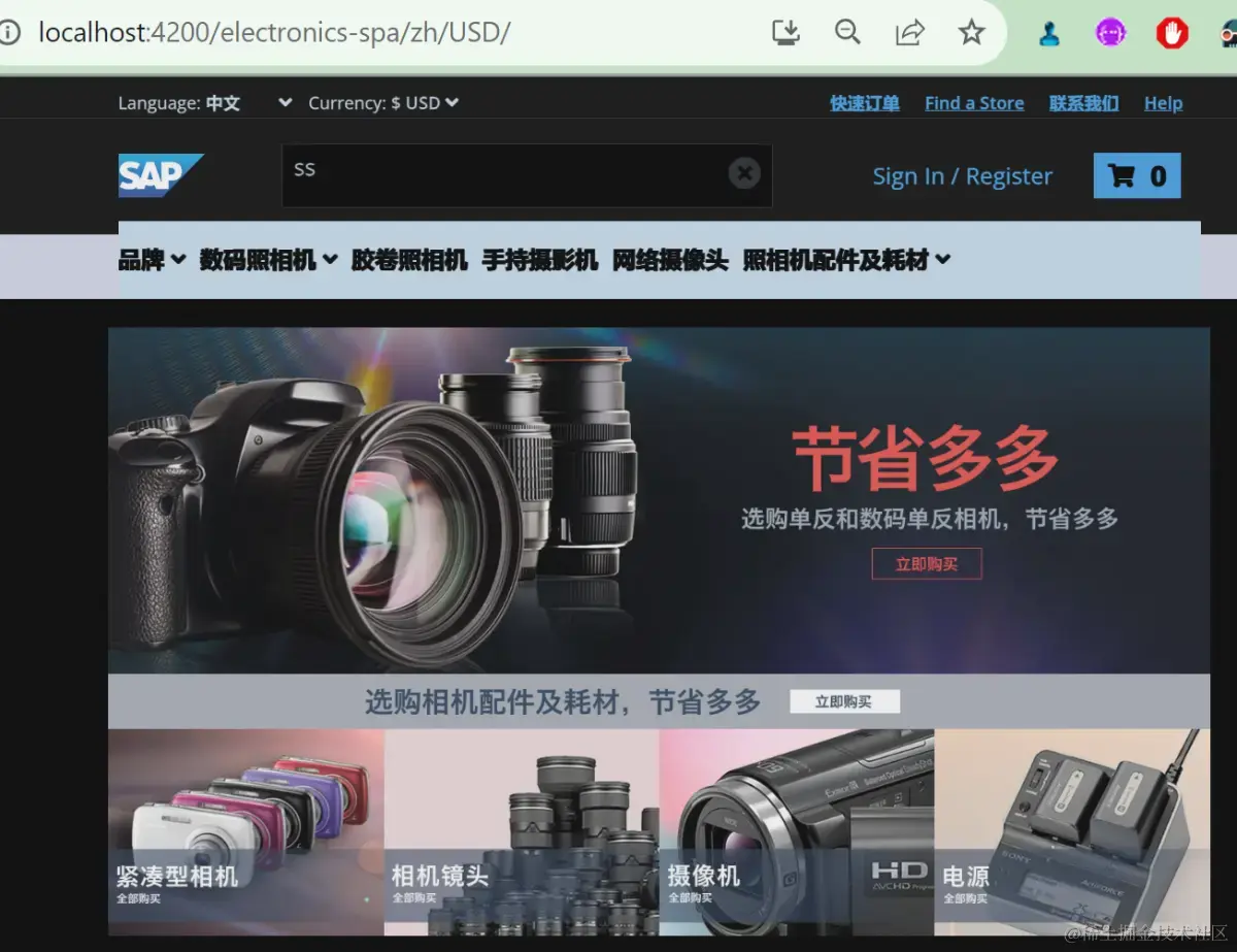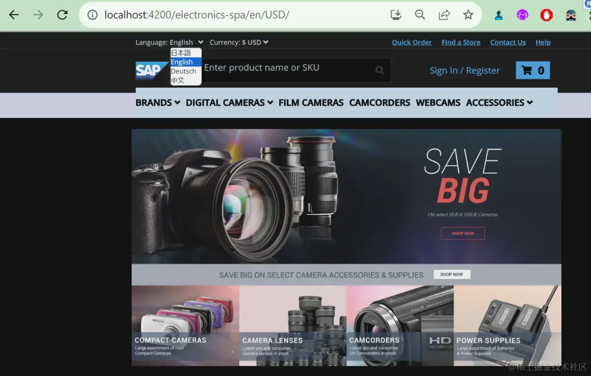 用户访问 Storefront 的 homepage,可以在 Language 的下拉菜单里,选择语言: