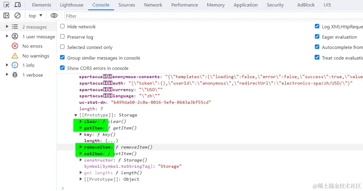 本文之前介绍的 LocalStorage API 就位于 localStorage 字段的原型链上,如下图高亮区域所示: