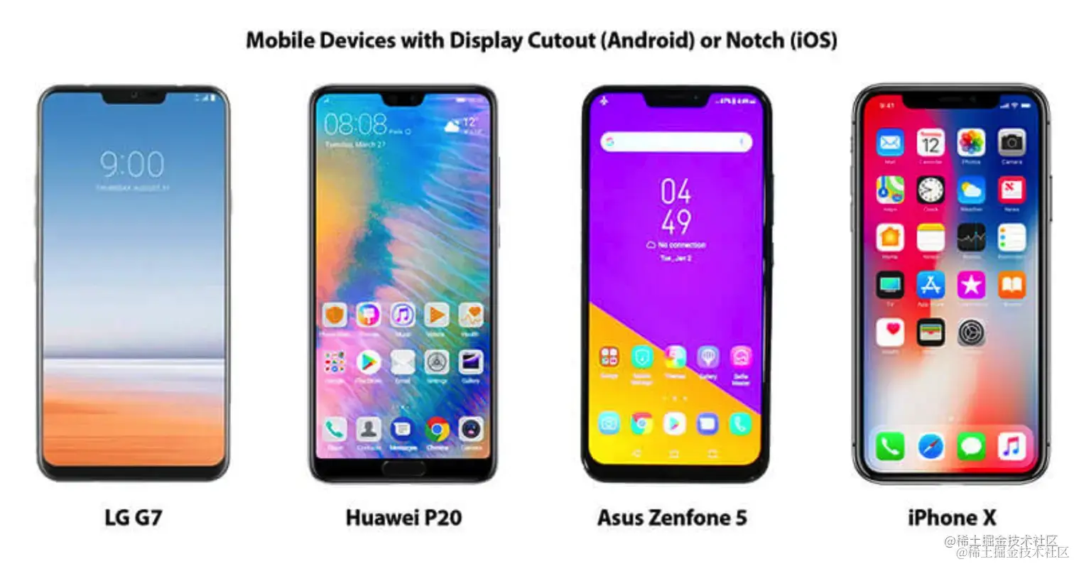 这些手机和普通手机在外观上无外乎做了三个改动:圆角(corners)、刘海(sensor housing)和小黑条(Home Indicator)。为了适配这些手机,安全区域这个概念变诞生了:安全区域就是一个不受上面三个效果的可视窗口范围。