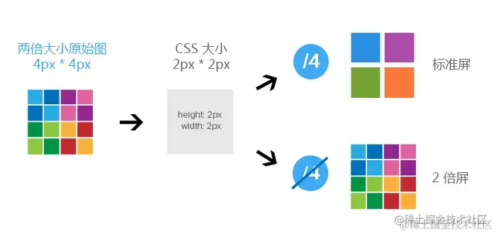 而在dpr > 1的屏幕上,位图的一个像素可能由多个物理像素来渲染,然而这些物理像素点并不能被准确的分配上对应位图像素的颜色,只能取近似值,所以相同的图片在dpr > 1的屏幕上就会模糊: