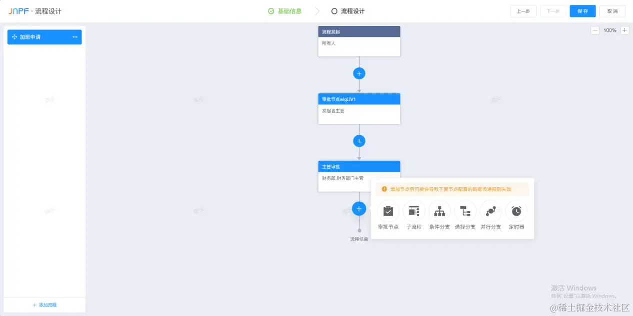 原本线下流程搬到JNPF平台上,支持包括条件分支、选择分支、并行分支、子流程、一流程多表单、一表单多流程、定时发送、超时提醒等等功能,可以自行体验。