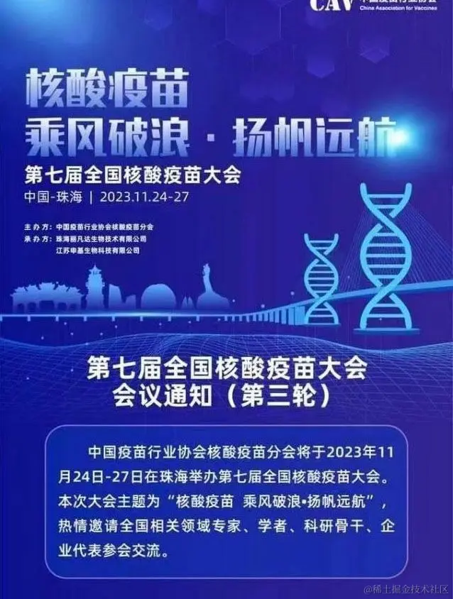 第七届全国核酸疫苗大会将于2023年11月24日—27日在珠海举办,主题为核酸疫苗 乘风破浪·扬帆远航。这次大会邀请了全国相关领域的专家、学者、科研骨干、企业代表前来参会交流。