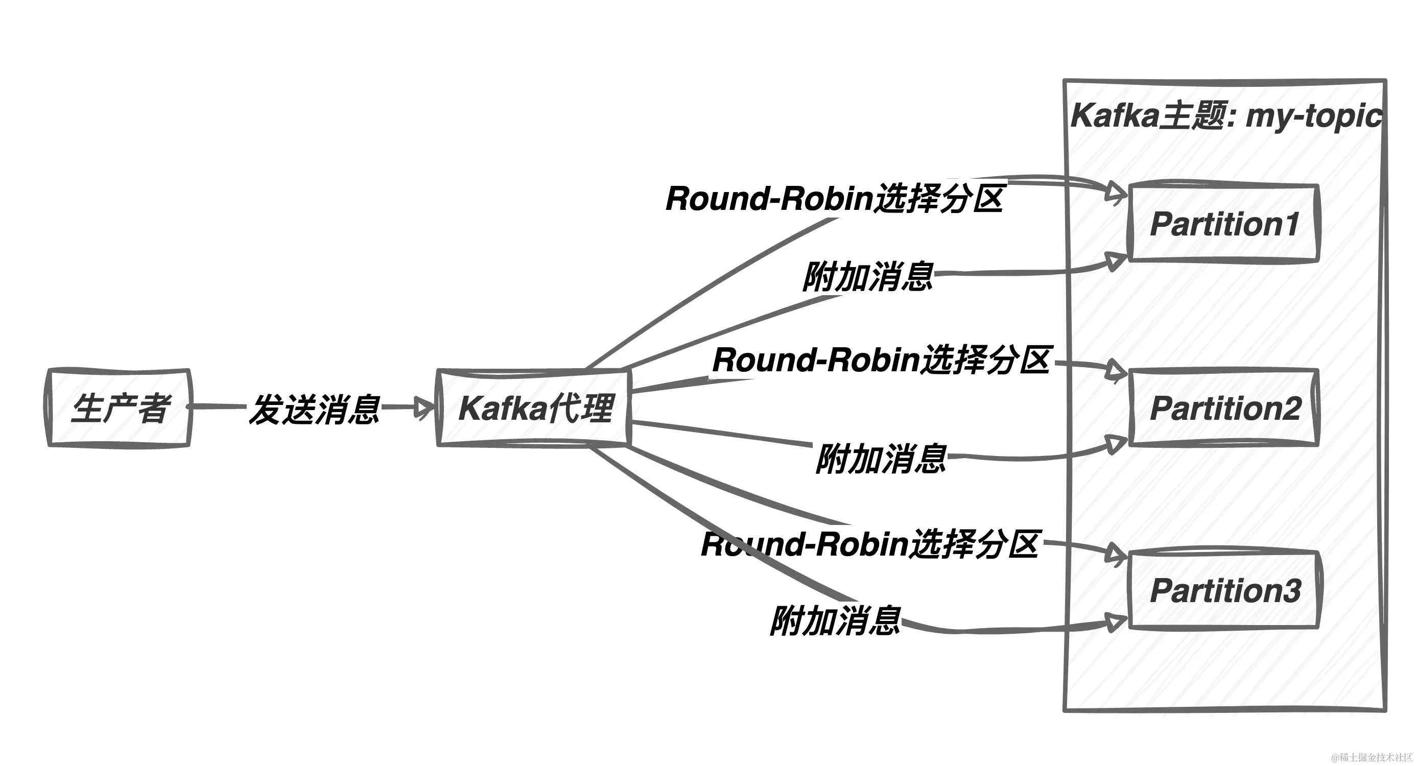 这段代码创建了一个Kafka生产者,使用Round-Robin分区策略将消息发送到名为"my-topic"的主题。这是一个简单但常见的用例,适用于那些不需要特定分区策略的情况,只需均匀地将消息分布到各个分区。