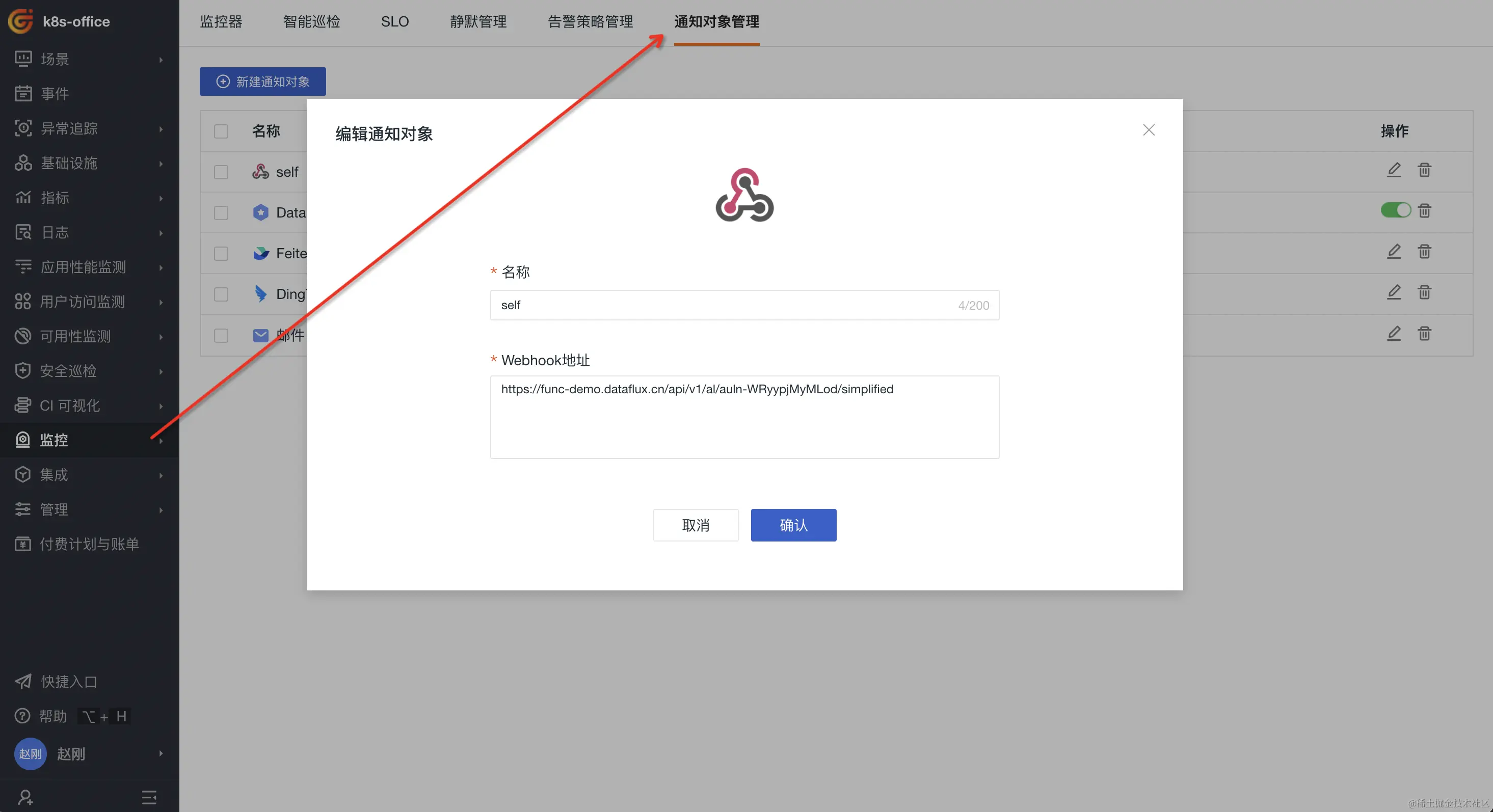 登录观测云工作空间,点击「监控」-「通知对象管理」-「新建通知对象」,来创建一个自定义通知对象,类型选择Webhook自定义。将上面获取的Func API地址复制到Webhook地址,表示事件触发时调用这个地址触发相关操作。填写名称后保存该自定义对象,这里名称为“self”