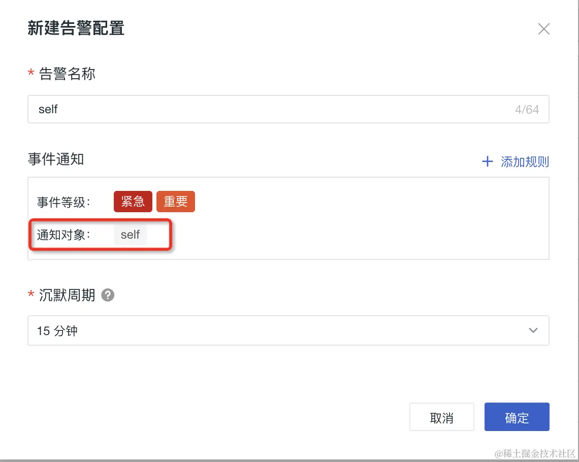 新建告警策略,在通知配置中,选择通知对象为刚配置的“Self”