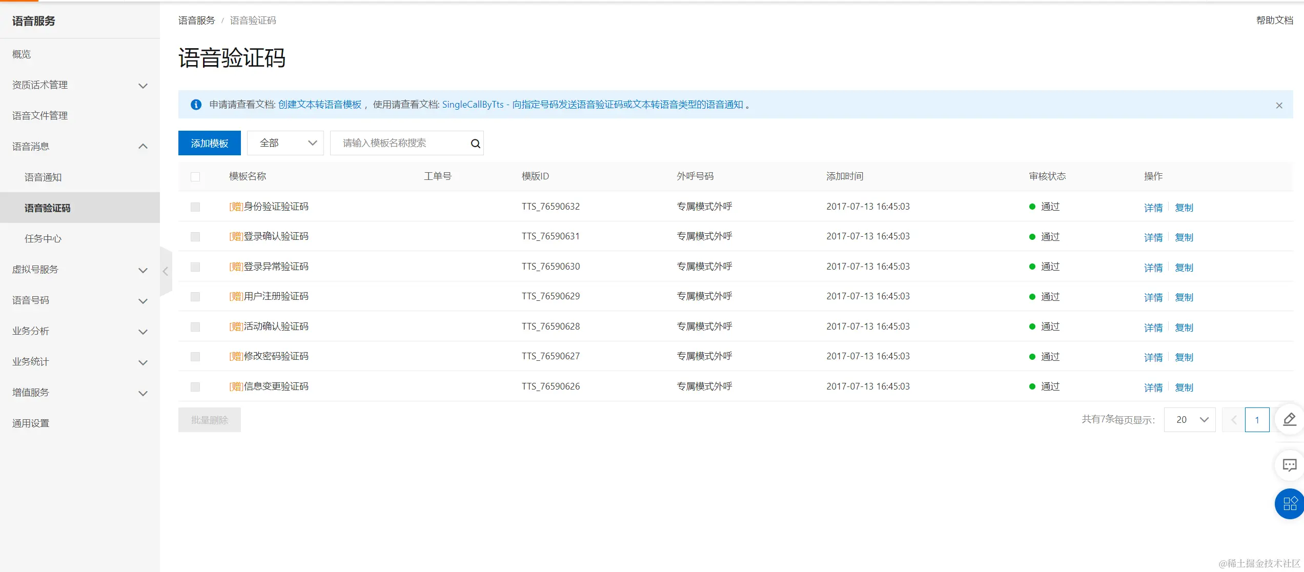 本例中,我们使用专属号码和提供的默认语音模版: