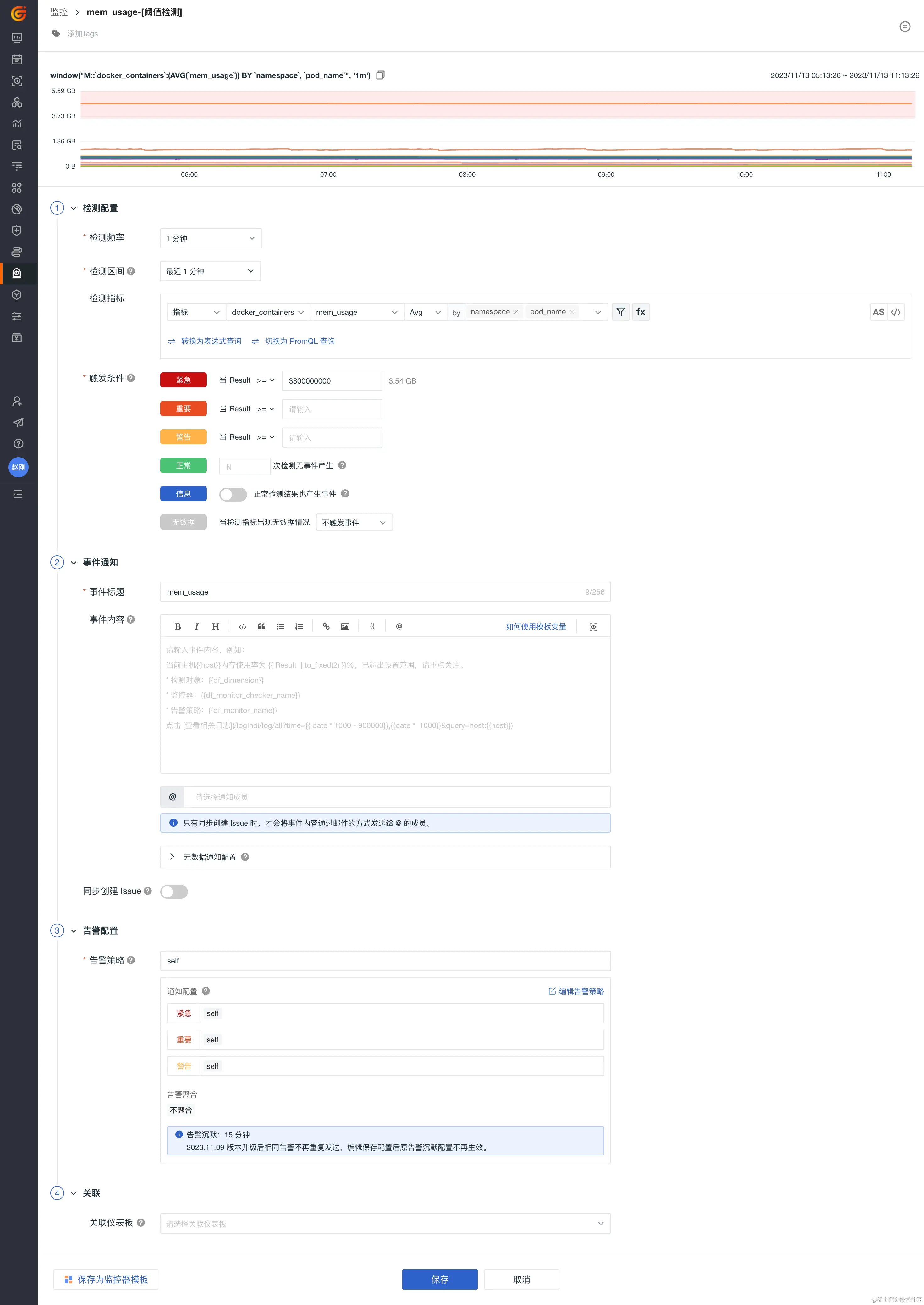 其中,【事件标题】设定的事件内容留空,检测指标中,聚合条件by选择以namespace和pod_name聚合告警数据。后面可以作为参数,发送给Webhook以便在Func代码中引用这些变量。
