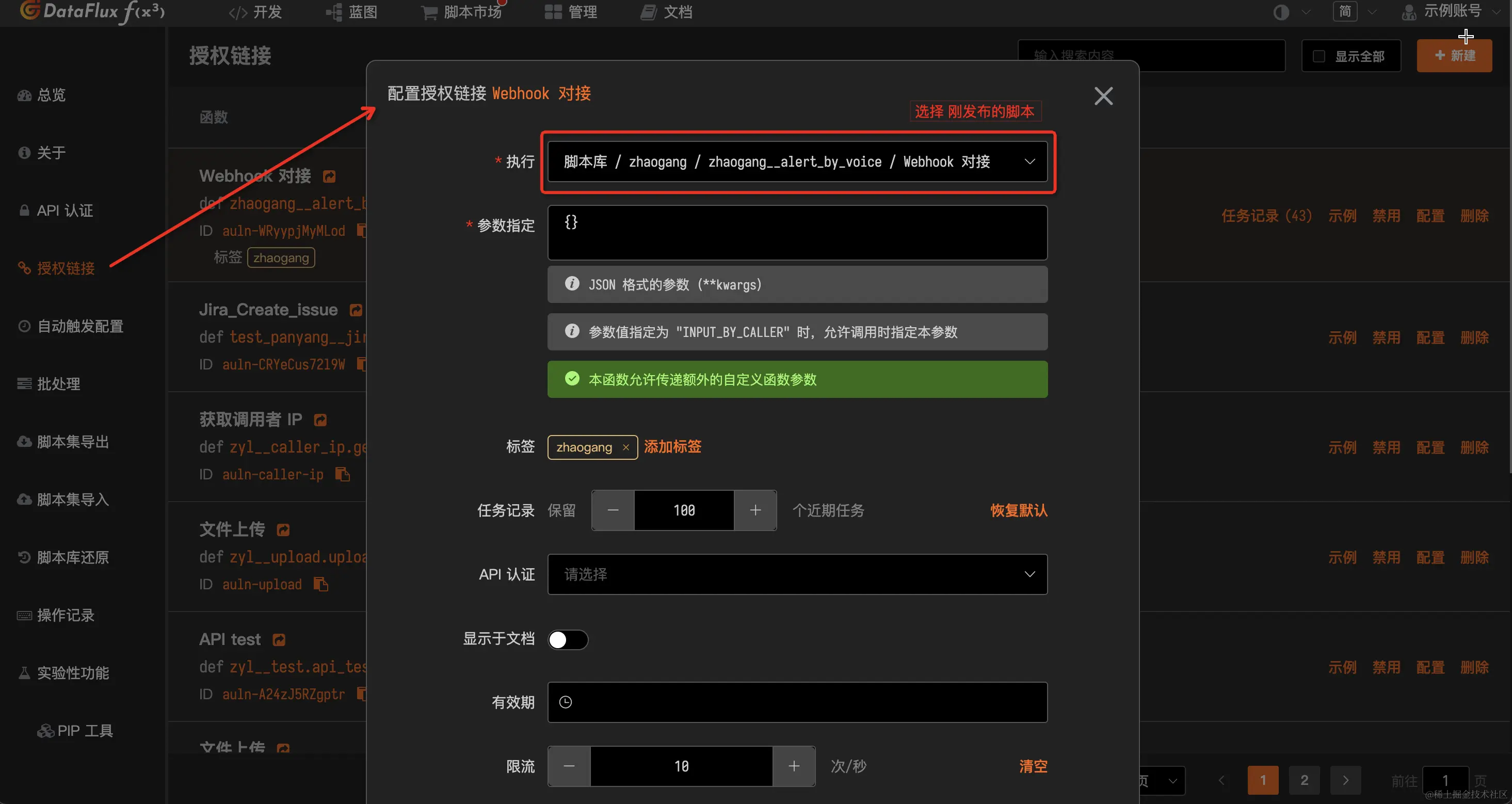 完成脚本发布后,点击「管理」-「授权链接」-「新建」,新建一个授权链接,即Func平台对外发布的API接口。授权链接配置时,在执行框中选择刚发布的脚本: