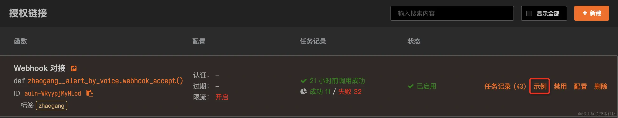 点击保存后,即可可在授权链接列表中看到对应的API接口。点击右边示例,获取WebHook地址: