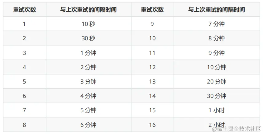 当然,RocketMQ 并不会无限重新投递消息给 Consumer 重新消费,而是在默认情况下,达到 16 次重试次数时,Consumer 还是消费失败时,该消息就会进入到死信队列。