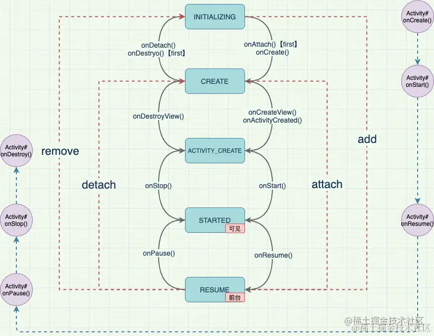 detach & attach: Fragment 状态在 CREATE 与 RESUMED 之间转移;