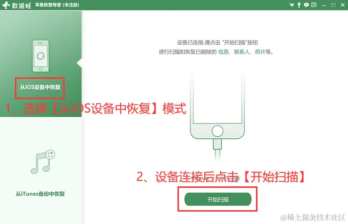 步骤2:选择【从iOS备份中恢复】模式,然后点击【开始扫描】按钮,等待软件扫描旧手机中的所有数据。