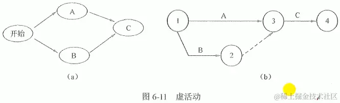虚活动,在网络图中由一个虚箭线表示。虚活动==不消耗时间,也不消耗资源==,只是为了弥补箭线图在表达活动依赖关系方面的不足。 活动A和B可以同时进行;只有活动A和B都完成后,活动c才能开始。