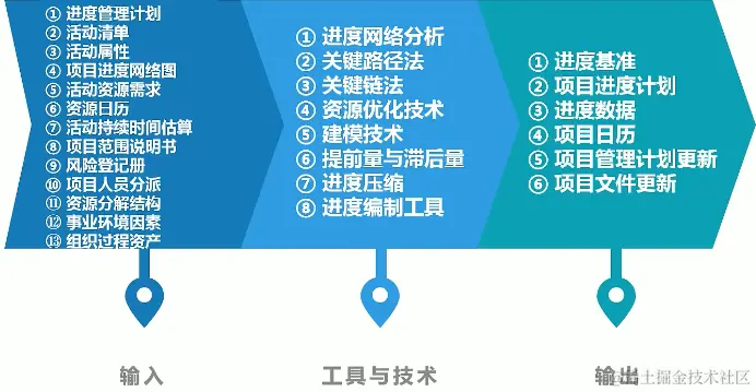 - 规划进度管理,就是提前针对进度管理的方方面面做好规划,包括使用什么工具、方法、技术来进行进度管理;