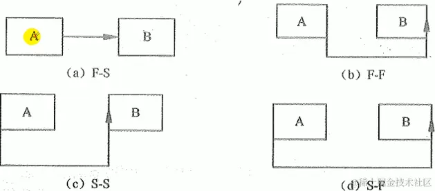 - 开始一结束的关系( S-F型)。前序活动开始后,后续活动才能结束。例如,只有第二位保安人员开始值班(紧前活动) , 第一位保安人员才能结束值班(紧后活动)。