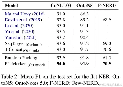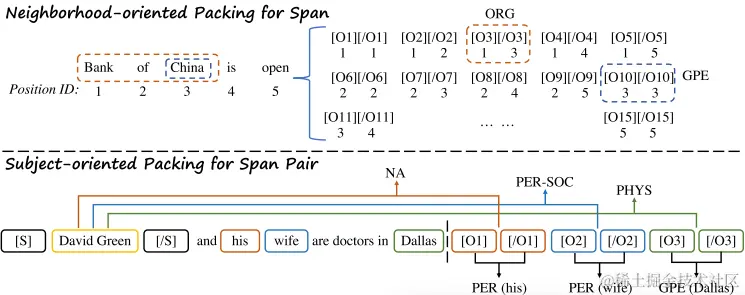 作者认为PURE方法在训练阶段处理不同的span pairs时,会在句子中独立的插入不同的typed markers,从而忽略了span pairs和spans之间的内在联系。因此提出了Packed Levitated Marker (PL-Marker),设计“打包策略”来建模span pairs或spans之间内在联系。在NER阶段,设计面向邻居的打包策略(neighborhood-oriented packing strategy)将拥有相同start token的多个span同时打包放入同一个训练实例中,以此来建模spans之间的内在联系,从而获得了优异的效果。