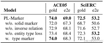 相比于subject和object分别使用两对的solid marker的方法,融合标记方案在object span上用levitated markers代替solid marker,==一定程度上削弱了对Object span的影响程度==。为了增加补充信息,新增了object到subject的反向关系的预测,从而实现了双向预测,实则就是==实现了Object-oriented packing strategy==,没有inversion relation的有0.9%-1.1%的性能下降。==体现出了object和subject之间信息的重要性==