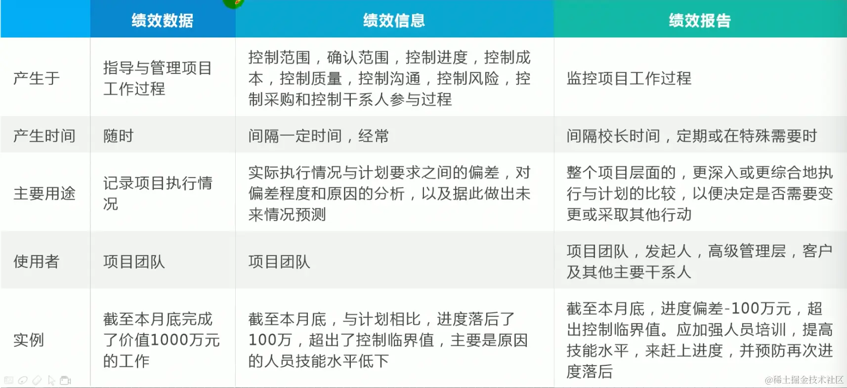 工作绩效数据:是在项目管理过程中,一边执行一边收集起来的,==未经任何加工整理的原始资料==,用于真实,完整地记录工作的执行情况。它是==指导与管理项目工作==过程的输出。是项目监控时用来与计划要求做比较的实际数据。