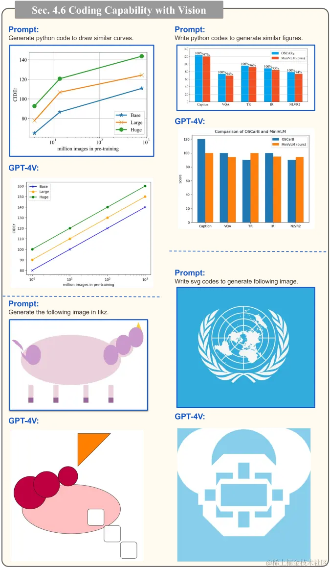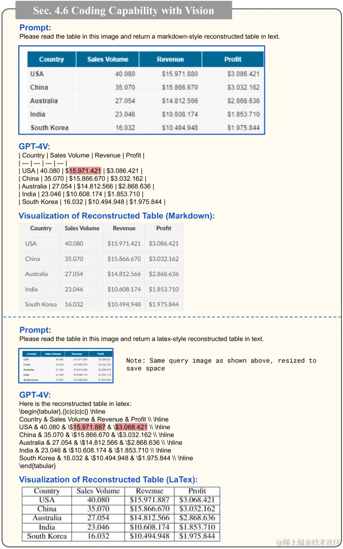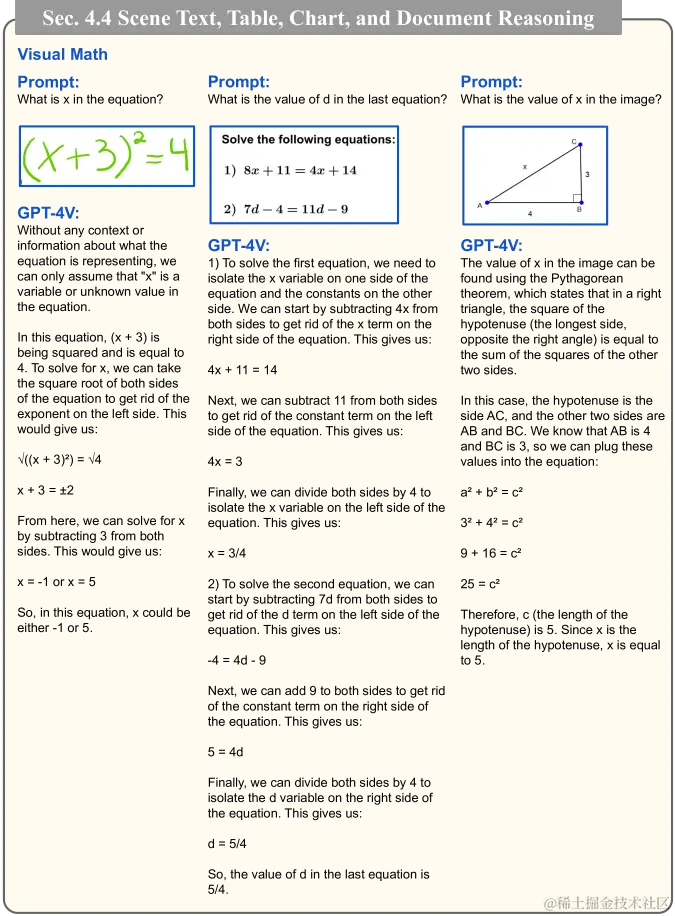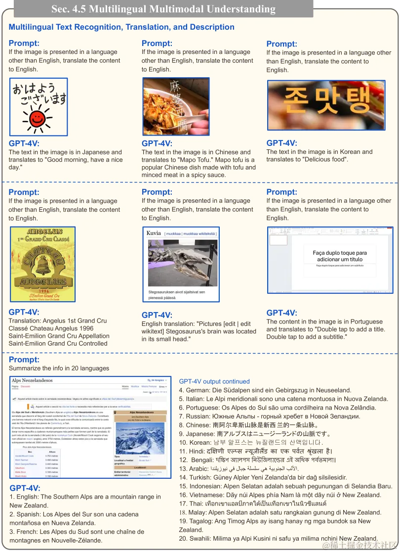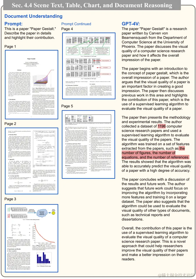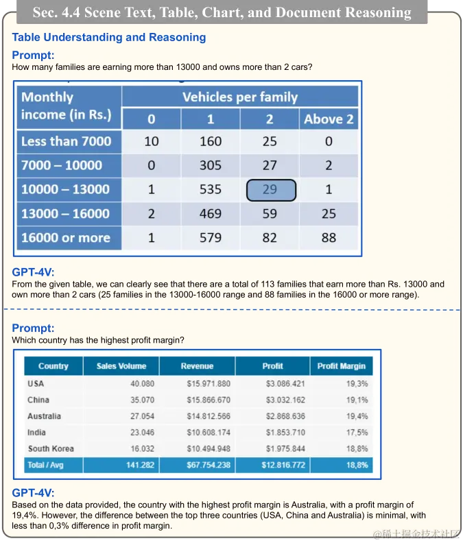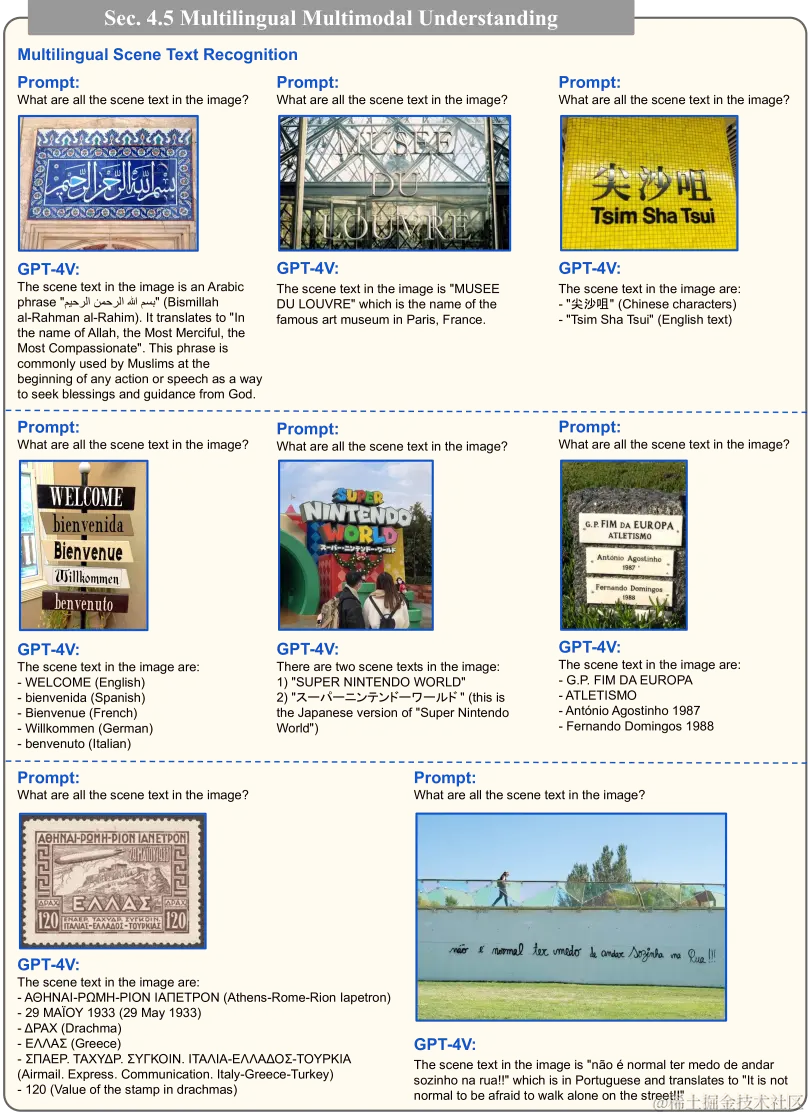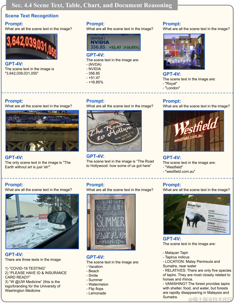 在 4.4 节,我们将深入评估模型分析各类来源信息(如场景文本、表格、图表及文档)的能力。4.5 节将探讨 GPT-4V 多语言环境下理解和生成描述的技巧。最后,4.6 节会研究模型如何运用视觉信息编程,并通过选定示例展示其完成任务的技能。