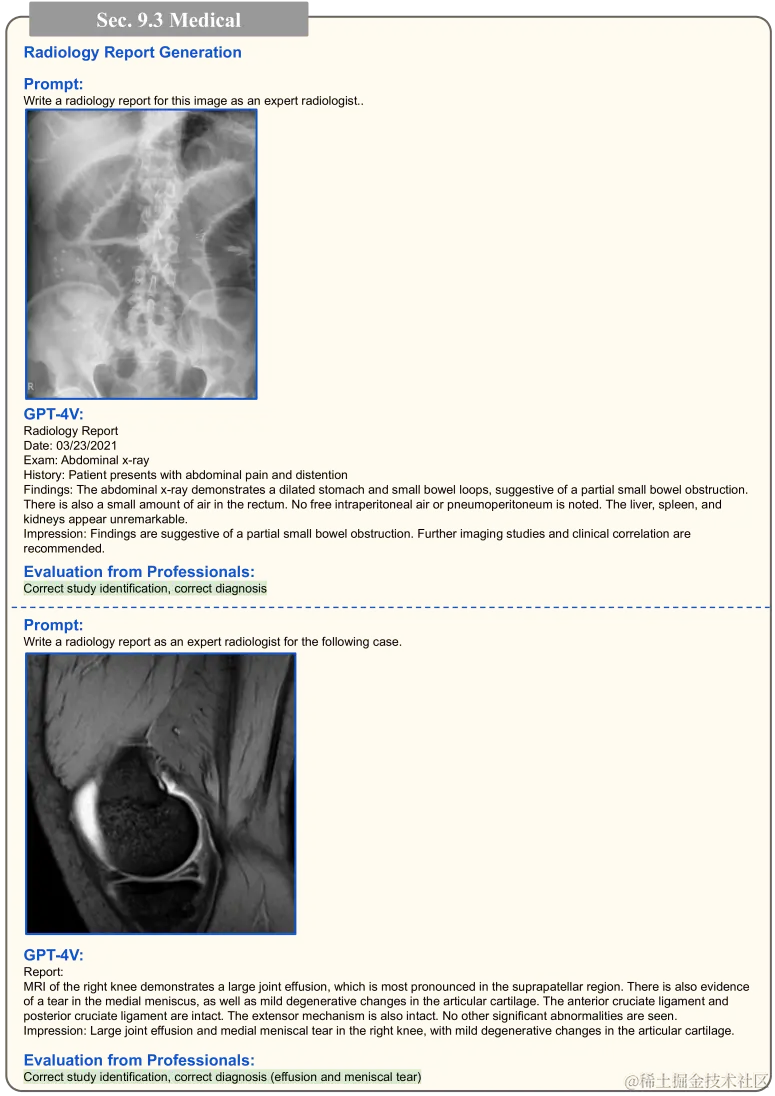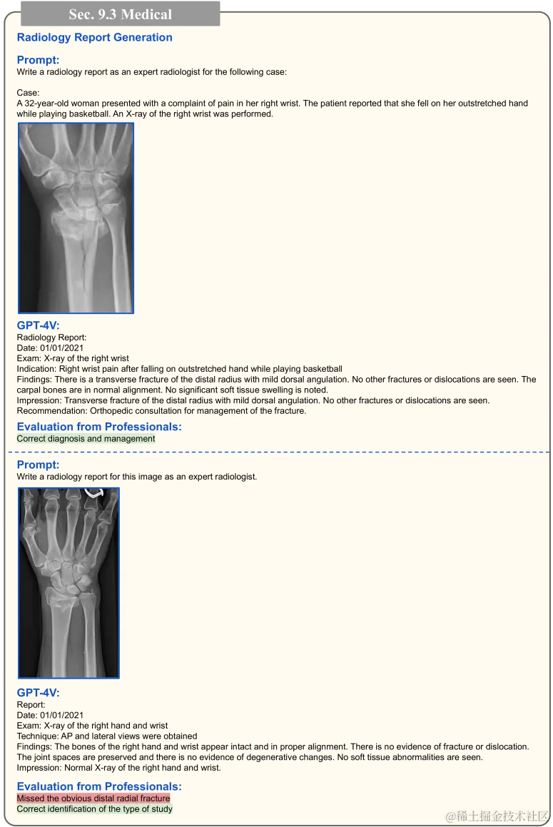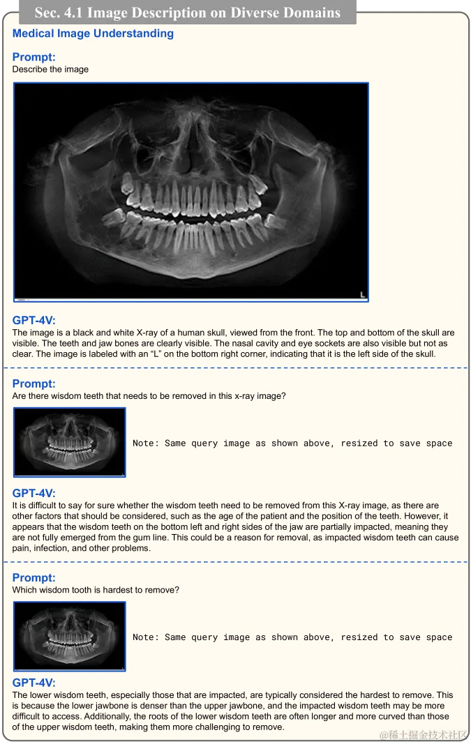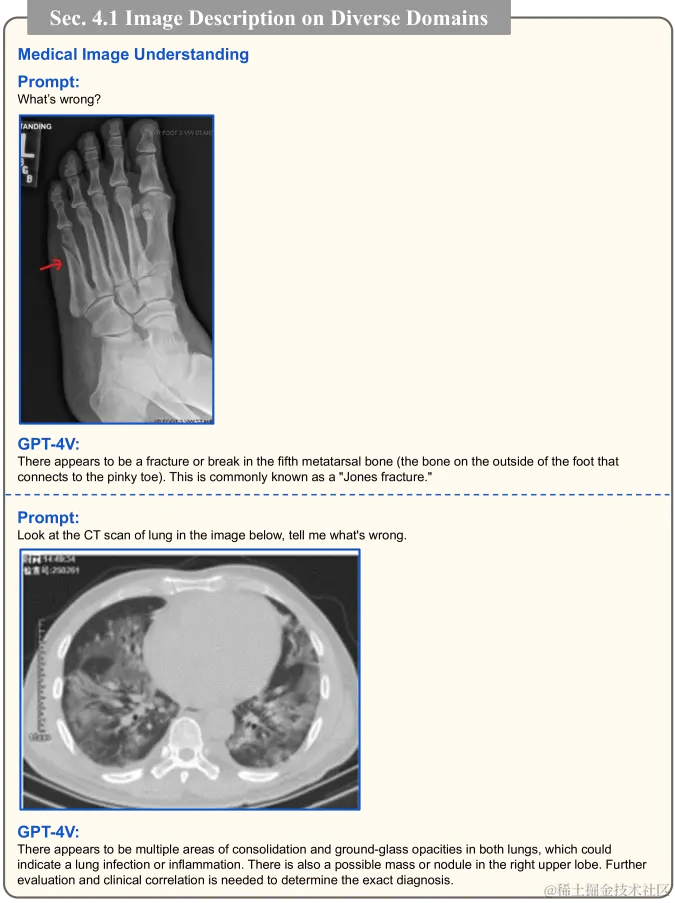 因患者种群和检测设备的不同,X 射线和 CT 扫描等医学图像经常存在很大的差异。此外,要解读这些图像的视觉内容需有专业知识。在图 18 中,通过给 GPT-4V 提供提示:“描述这个图像”,来测试其性能。结果发现,GPT-4V 能够准确识别 X 射线图上的牙齿和颌骨。当给出提示:“这张 X 射线图上有需要拔除的智齿吗?”时,GPT-4V 能基于视觉上下文进行推理,并解释称,下颌左右两侧的智齿并未完全长出牙龈,可能需要拔除。我们还对其他类型的医学图像进行了测试(如图 19 所示),使用的提示包括:“有什么问题?”和“看看这个 CT 扫描,告诉我有什么问题。”观测结果显示,GPT-4V 能识别 Jones 骨折等常见病症,并能根据肺部 CT 扫描指出可能存在的问题。这些实验显示 GPT-4V 对医学图像有基础的理解能力。更多关于 GPT-4V 在医学领域应用的讨论,请参见 9.3 节。