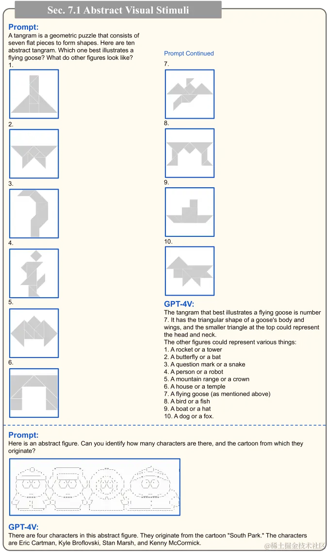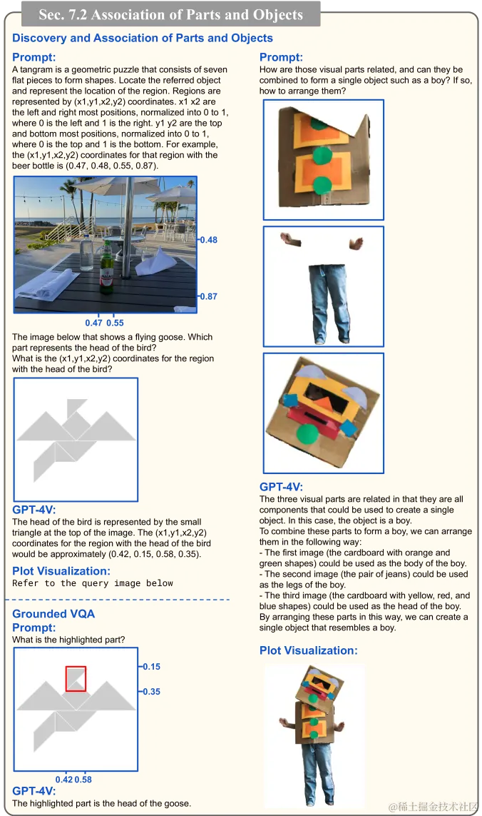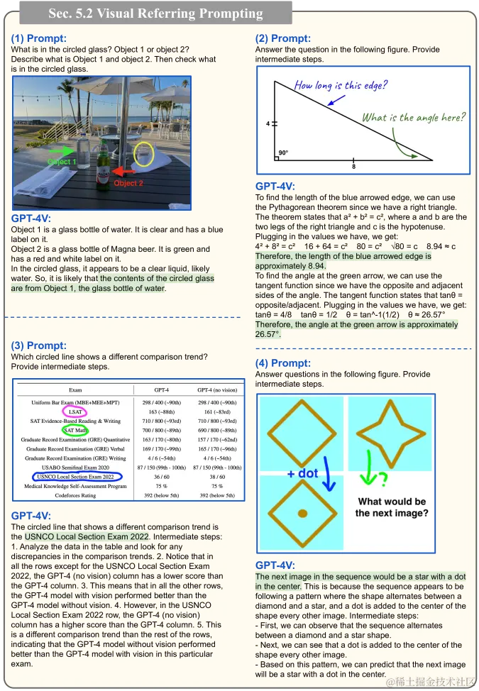 视觉指示提示可以和其他图文提示无缝集成,提供了一种细致的界面,精简而清晰地展现了问题的核心。图 7 通过两个例子展示了 GPT-4V 提示的灵活性,特别体现在集成不同输入格式并在输入中自然结合指令和示例的能力。GPT-4V 的通用性和灵活性使其能像人类一样理解多模态指令,并能适应各种未曾见过的任务。