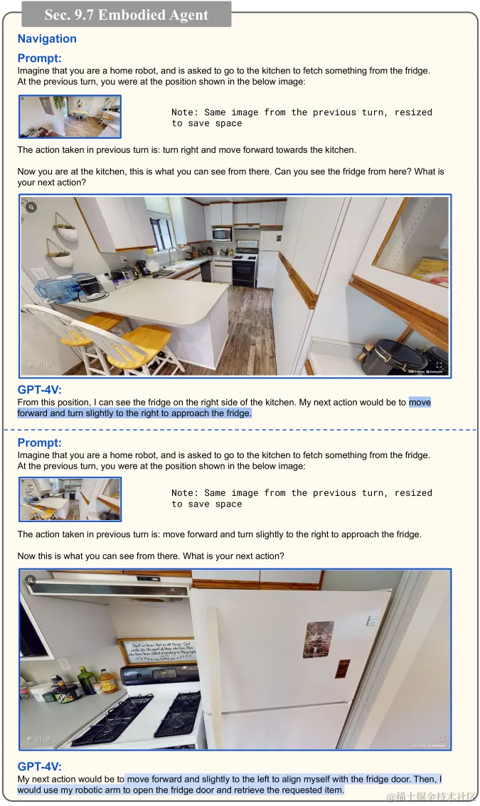 导航部分,为了测试导航功能,我们利用 Redfin 虚拟房屋导览,以此模拟实体代理可以互动的环境。我们的目的是检验 GPT-4V 在具体任务场景下的表现。图 90-91 展示了一个例子,GPT-4V 最初接收到虚拟房屋导览的入口图片,该图片显示了从房间一角到客厅的视野。我们指派给 GPT-4V 的任务是“前往厨房,从冰箱取出一样物品”,通过这个任务,我们希望引导 GPT-4V 预测接下来的操作。