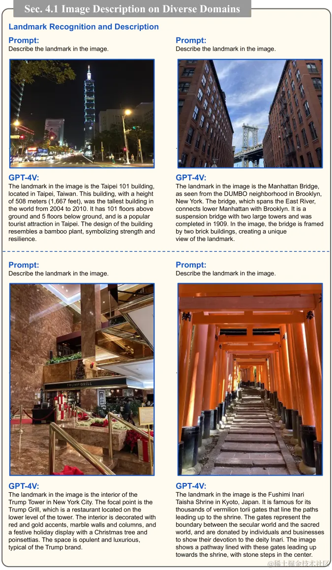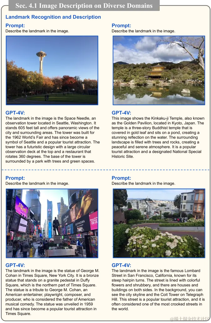 由于角度、光线、遮挡以及季节的变化,地标的外观会呈现出极大的差异。为了在这些复杂情境下识别地标,模型需具备卓越的泛化能力和对不同视觉外观的处理能力 Zheng et al. (2009); Agarwal et al. (2011)。在测试中,我们使用了简单直白的文本提示:“描述图片中的地标”,来检验模型的性能。如 Figures 15-16 所示,GPT-4V 能为每张测试图片生成准确且不设限的描述。比如,它准确无误地辨识出位于华盛顿州西雅图的 Space Needle,并了解这座塔是为 1962 年世界博览会所建,后来更成为了城市的标志之一。其他测试图片也得出了相似的观察结果。生成的描述不仅限于简单的标签或通用语句,更是提供了形象生动且详尽的叙述,深刻揭示了每个地标的独特之处。