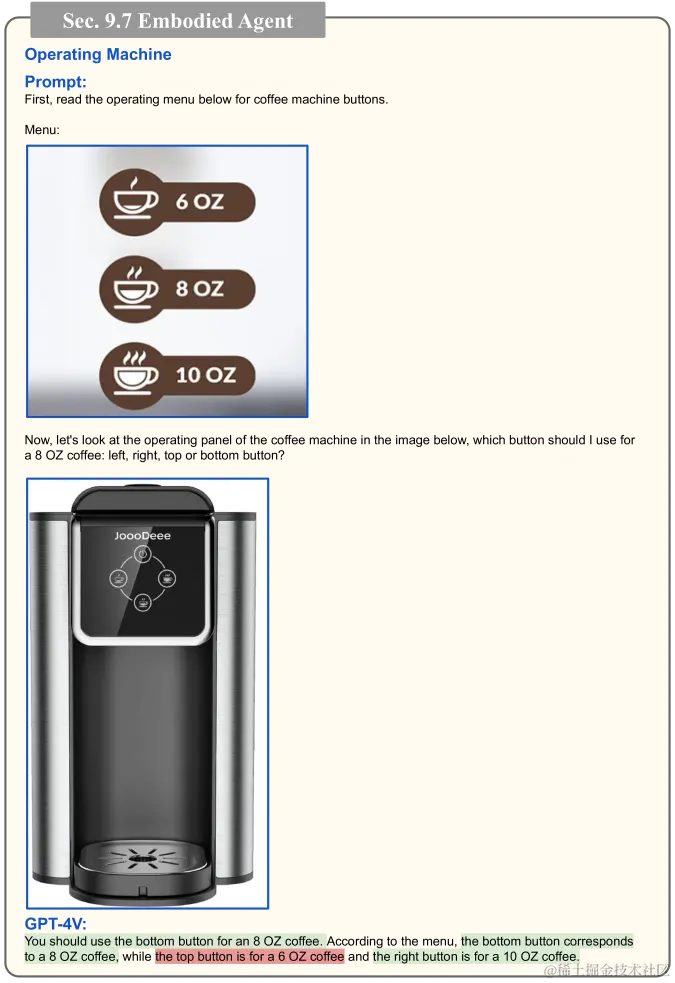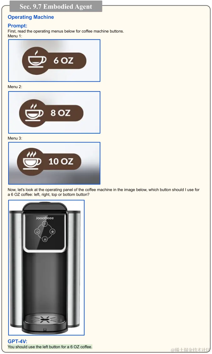 想象一下,你刚购买了一台崭新的咖啡机,让你感到惊喜的是,你的家庭机器人 GPT-4V 已经学会了如何帮你操作它。在我们的实验中,我们提供了一张包含插图和文字的操作菜单图片(图 88)给 GPT-4V。我们要求 GPT-4V 找出与咖啡机操作面板上的“8 OZ 咖啡”选项对应的按钮。出乎意料的是,GPT-4V 不仅成功找到了“8 OZ 咖啡”按钮,还识别出了“10 OZ 咖啡”的按钮。然而,可能是由于菜单和咖啡机上“6 OZ 咖啡”选项的位置导致的视觉混淆,GPT-4V 错误地将电源按钮识别为了“6 OZ 咖啡”的按钮。为了解决这一问题,我们采取了一种方法:单独展示每个按钮的操作菜单,并将这些菜单一起呈现给 GPT-4V(图 89)。经过这种调整,GPT-4V 现在能够准确地识别出“6 OZ 咖啡”按钮的准确位置。