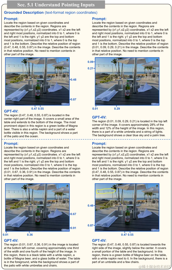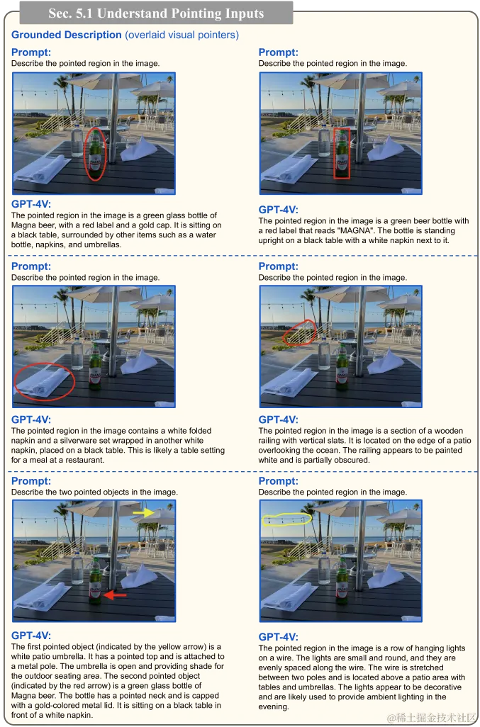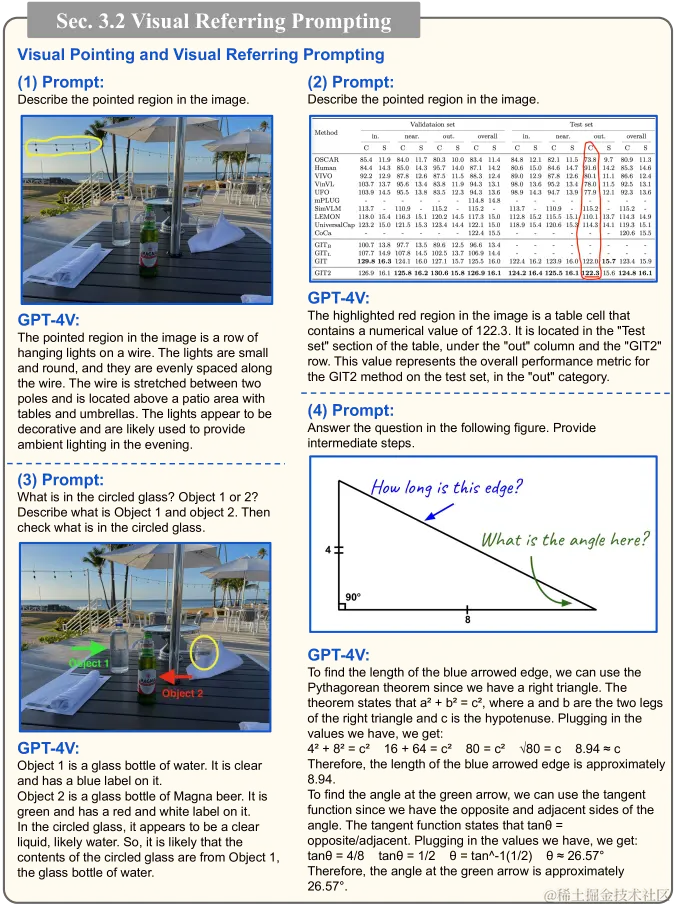 指向是人际交互的基础行为 Malle 等人(2001)。为了模拟这一互动方式,研究人员探索了多种“指向”方式,以引用空间感兴趣区域。比如,如图 5 显示,可以通过数字空间坐标(例如框坐标和图像裁剪)或图像像素上的视觉标记(比如箭头、框、圆或手绘)来表示“指向”。我们发现 GPT-4V 在理解直接绘制在图像上的视觉指标方面表现出色。考虑到在图像上绘图的灵活性,这一特点未来可用于野外人机互动 Mani 等人(2020); Shtedritski 等人(2023); Zhu 等人(2023)。为此,我们探索了一种名为视觉参考提示的新方法,人们可以编辑输入图像的像素空间以指定期望的目标,比如绘制视觉指针或手写场景文本。如图 6 所示,与常规文本提示不同,视觉参考提示通过编辑图像像素来执行任务。举个例子,它可以是简单的描述,关注指向物体的描述,同时保持对整个图像上下文的理解,如图 6(1,2)所示。此外,视觉参考提示还开启了其他新的使用场景,比如将指向的物体与场景文本中的索引关联起来(图 6(3)),或是解答靠近查询的边缘或角度提出的问题(图 6(4))。更多关于视觉参考提示的详细讨论见第 5 节。