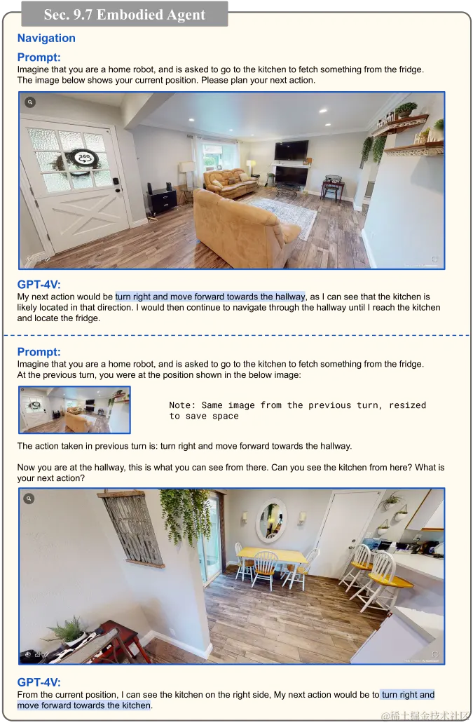 如图 90 所示的上半部分,GPT-4V 在导航的第一步预测了起始动作,即“向右转,朝走廊方向前行”。GPT-4V 是基于一个假设做出这一预测的,也就是厨房很可能位于那个方向。我们手动通过一个视觉房屋导览界面实现了这个动作,并记录下了动作执行后的画面,这个画面随后用于指引 GPT-4V 的下一步动作,如图 90 下半部分所示。在整个过程中,我们一直记录着上一个转弯的信息,为 GPT-4V 后续的动作提供了必要的上下文。