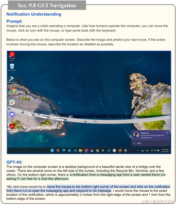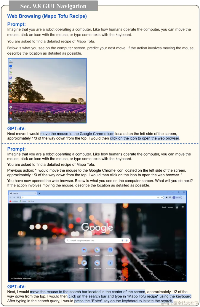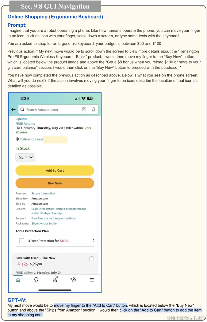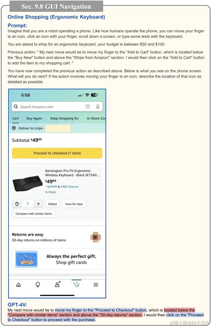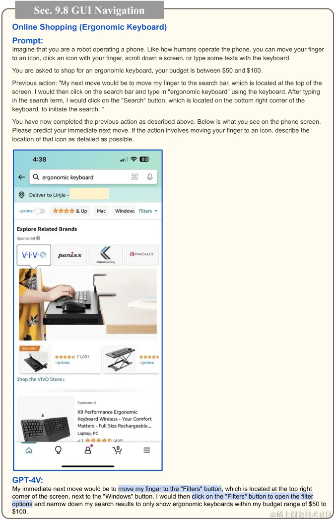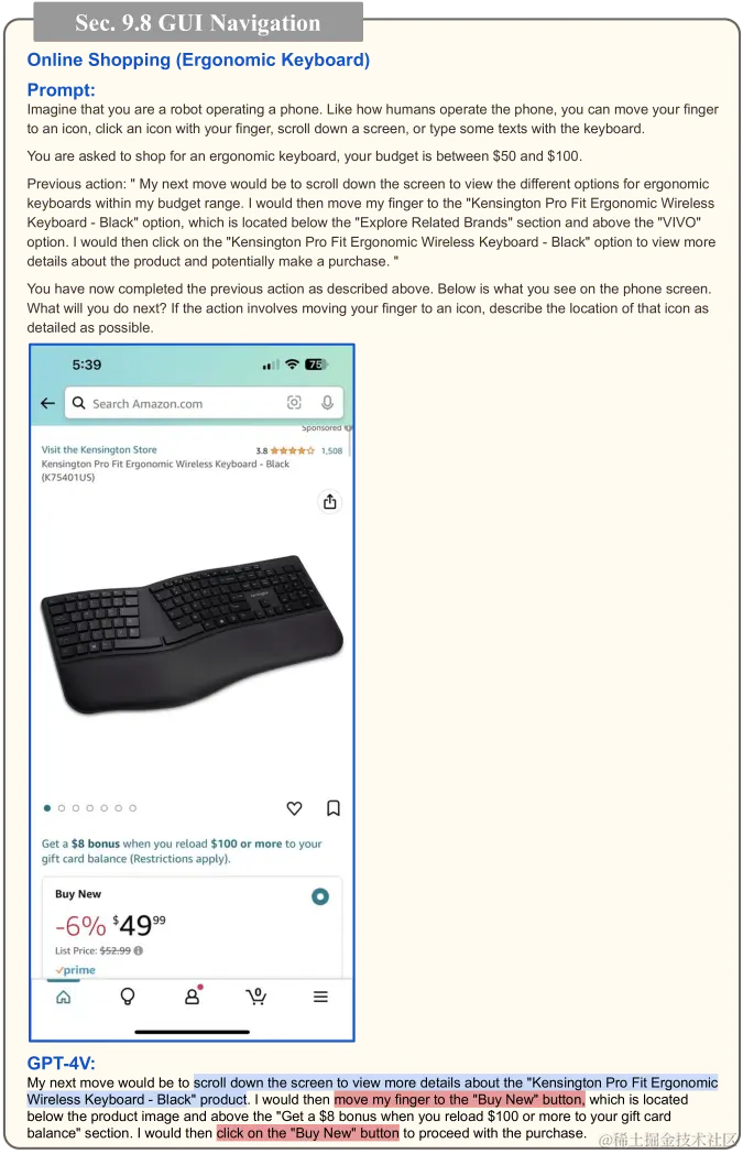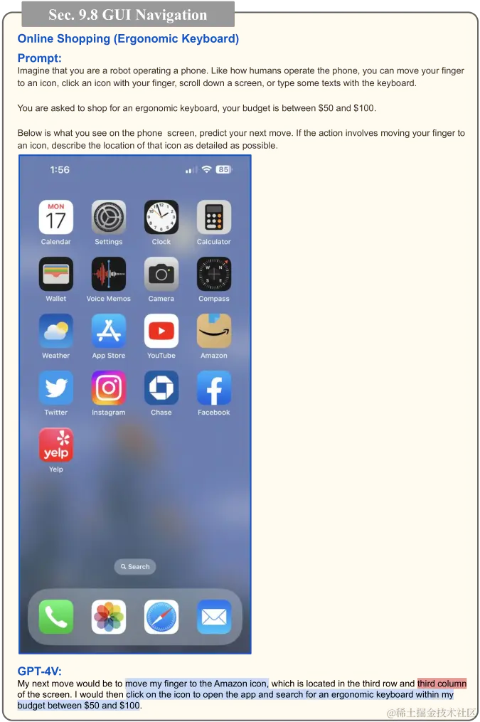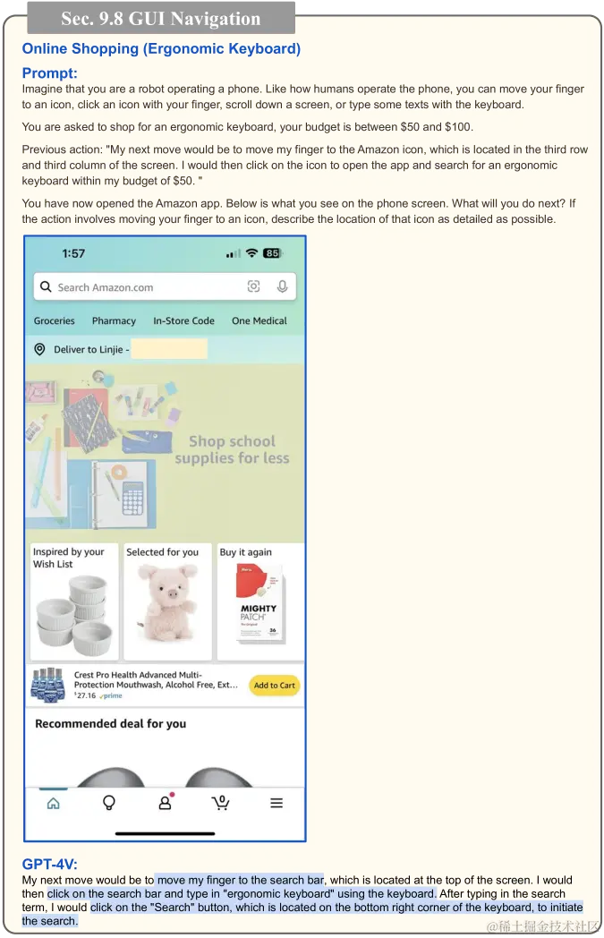 本节不仅介绍了 GPT-4V 在实体世界导航方面的能力,更重点展现了其在计算机或手机的图形用户界面(GUI)上的互动和导航才能。我们进一步探讨了 GPT-4V 完成如网络浏览、网上购物等复杂任务的可能性。