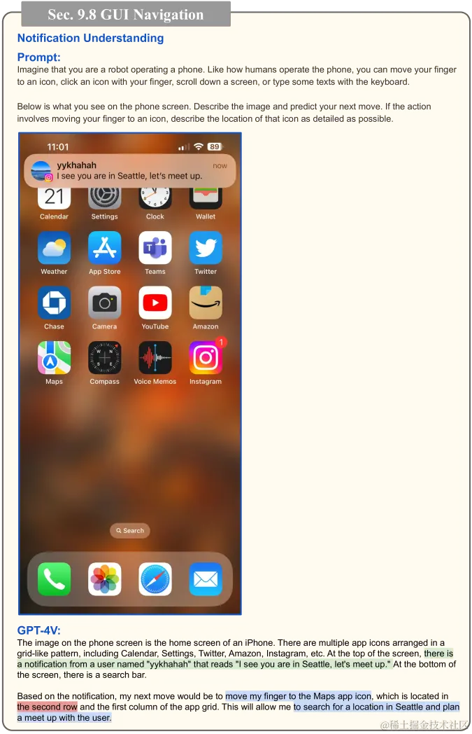 图 112:GPT-4V 收到通知并进行操作预测,能准确识别通知及其内容(绿色高亮)。预测操作以蓝色标出,而 Maps app 图标的位置误差则以红色标出。更多细节请参见第 9.8 节。