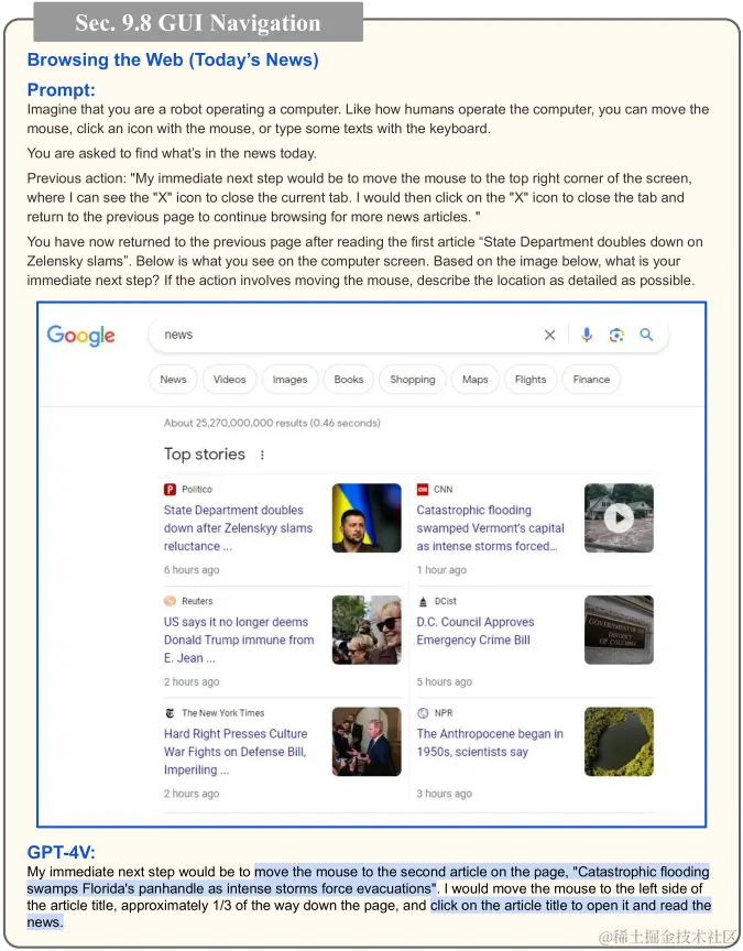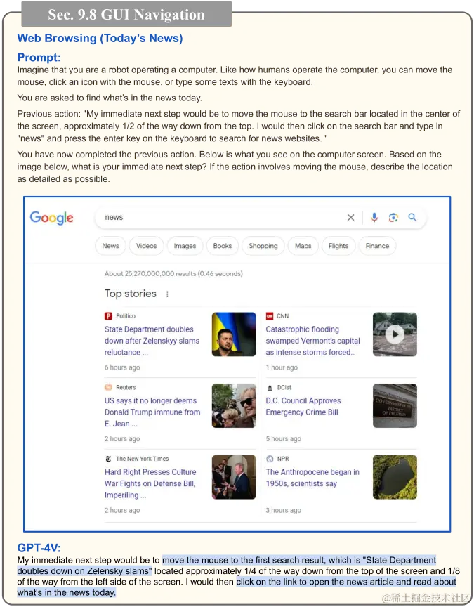 图 101:GPT-4V 通过图形界面浏览网页,查看当天新闻。预计的操作步骤用蓝色突出显示。更多详细讨论请参见第 9.8 节。
