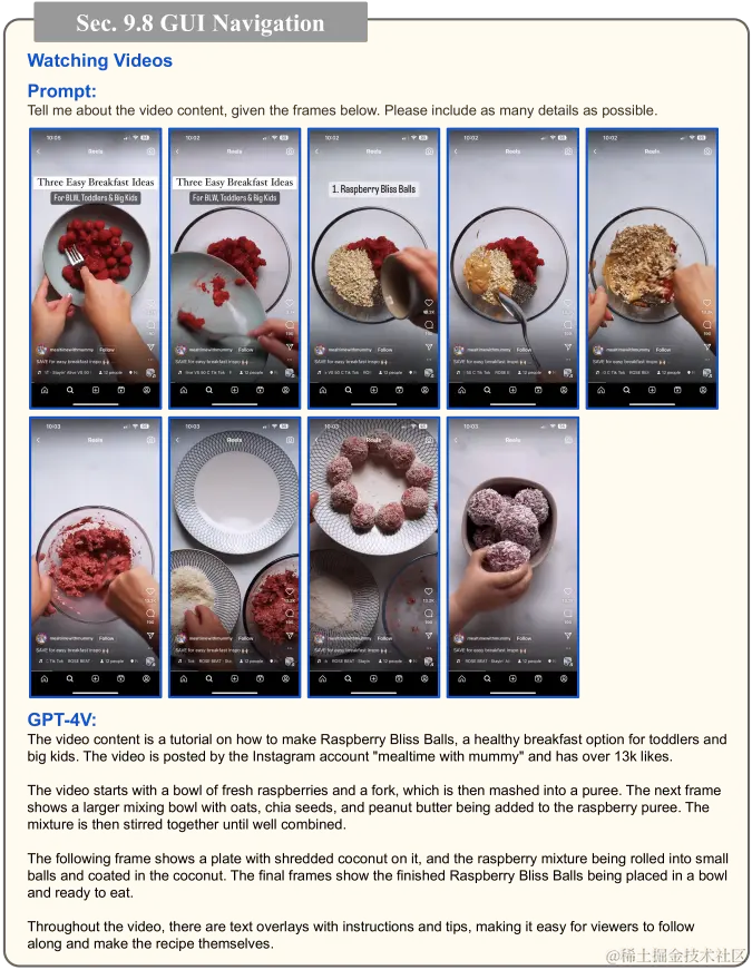 图 117:网上视频观看实例。图展示了 GPT-4V 捕获的视频帧,按照在原视频中出现的时间顺序排列。为简洁,我们将第 1-5 帧放在上一行,6-9 帧放在下一行。详情请查阅第 9.8 节。