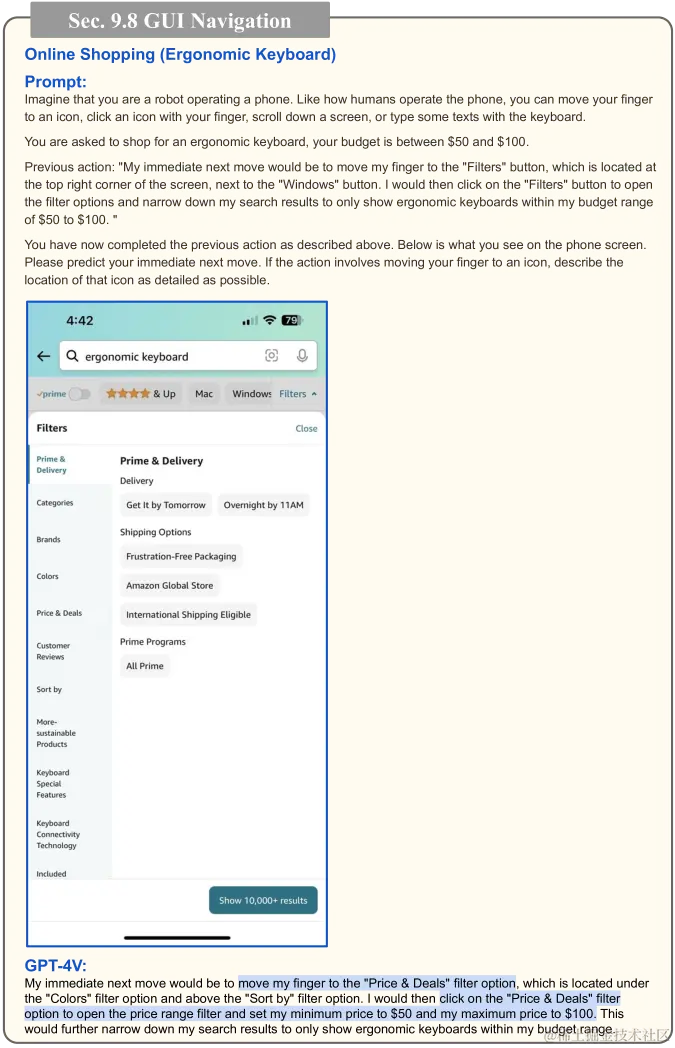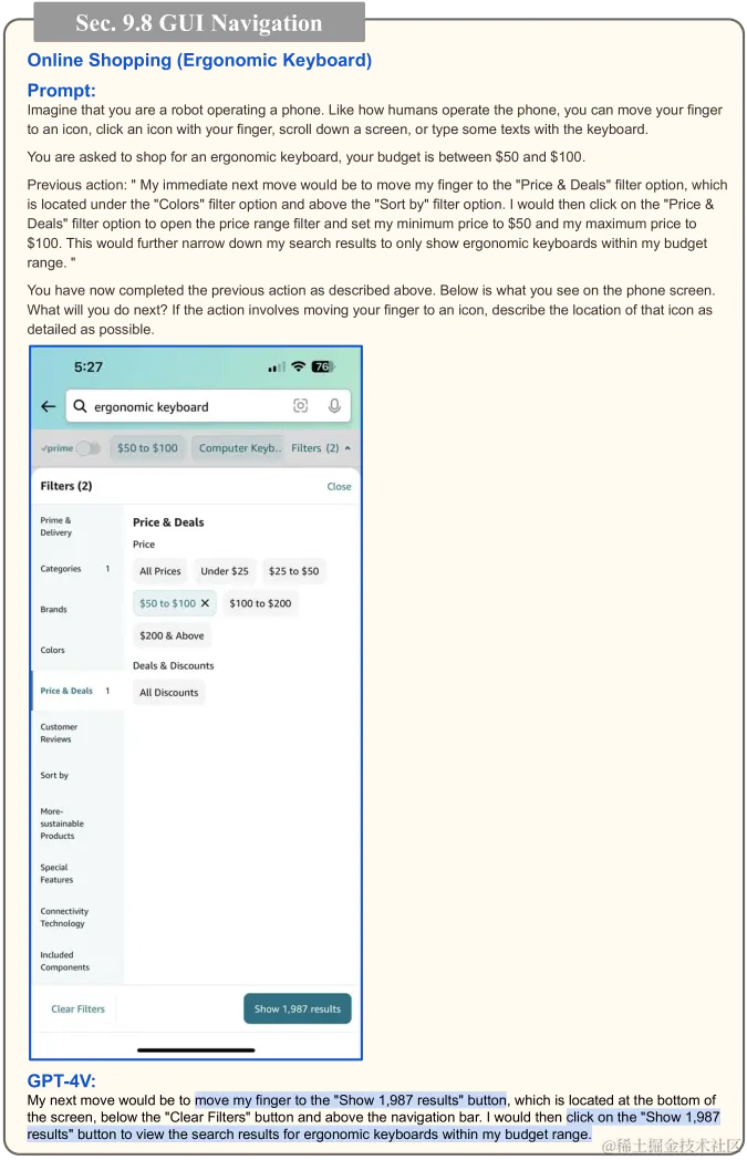 图 103 至 111 展示了 GPT-4V 如何操作智能手机界面完成购物流程。我们展示了给 GPT-4V 的手机屏幕截图和可能的操作动作列表(比如移动到图标,点击图标,下滑屏幕,或者使用键盘输入文本),以及购买一款 50 至 100 美元预算范围内的人体工学键盘的任务。在此过程中,GPT-4V 预测了依次打开 Amazon App(图 103),搜索人体工学键盘(图 104),打开过滤选项(图 105),设置 50 至 100 美元的价格过滤(图 106),展示过滤后的结果(图 107),选择搜索排名第一的产品(图 108),查看商品详情(图 109),将商品加入购物车(图 110)并进行结账(图 111)的完整操作流程。