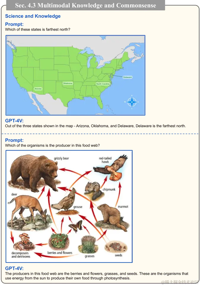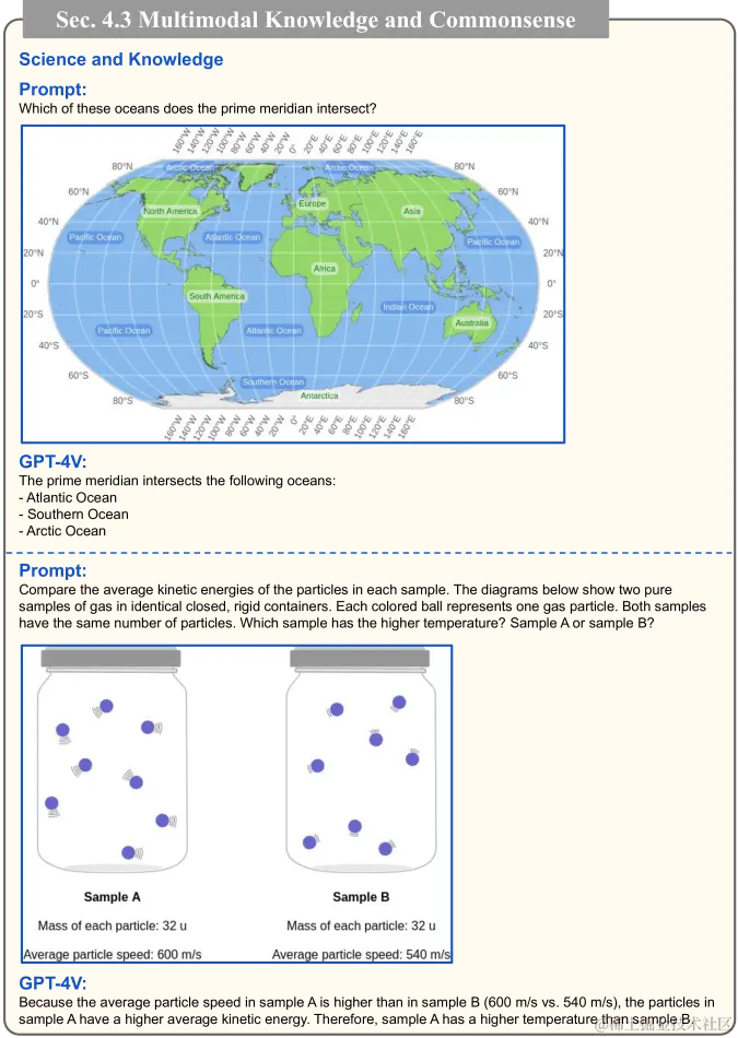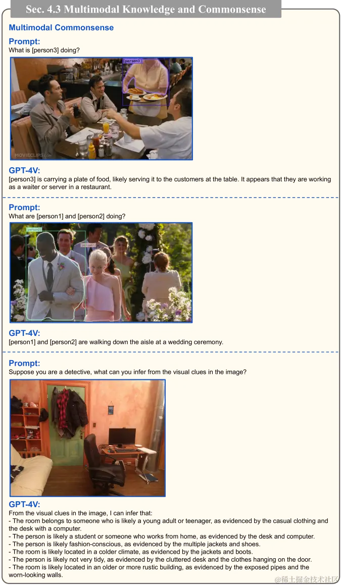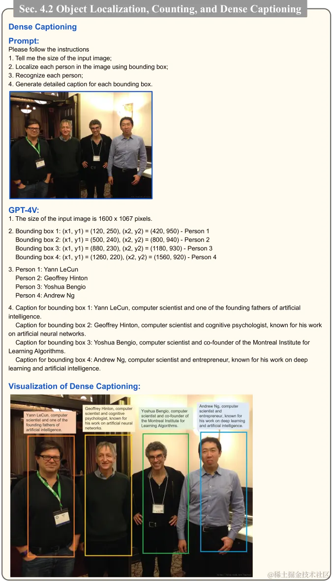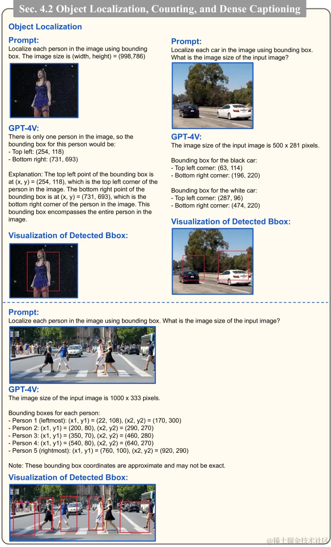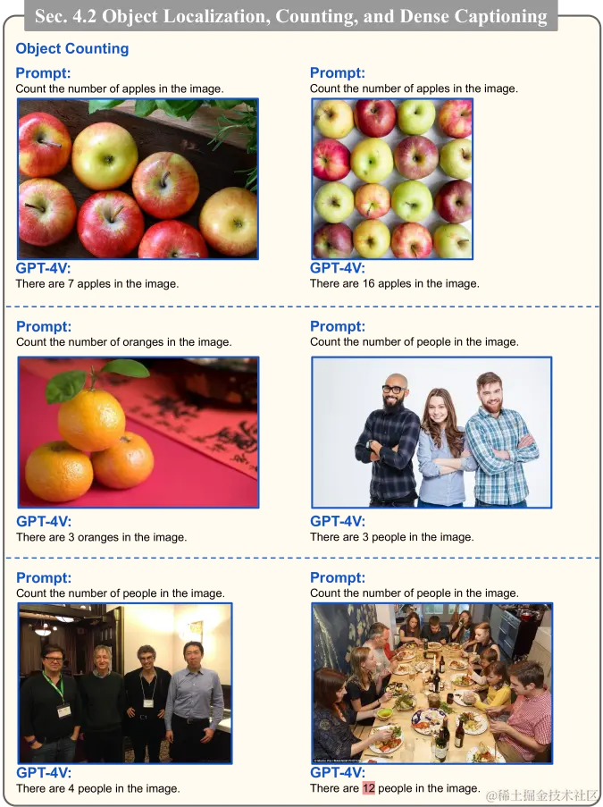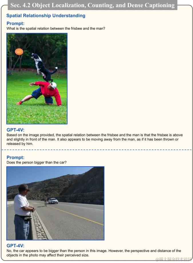 在接下来的第 4.2 节,我们将研究 GPT-4V 在更为高级的视觉任务中的应用,这包括空间关系分析、物体定位、物体计数以及生成密集的文字描述。而在第 4.3 节,我们将探索该模型在多模态知识和常识推理方面的表现,并研究其是否能够理解不同信息类型间的上下文及其关系。