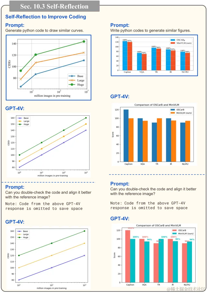如图 122 所示,通过自我反思 Shinn 等人 (2023); Madaan 等人 (2023); Kim 等人 (2023),改进了图 47 的结果。可以看出,经过自我反思后,结果更接近参考图像。例如,左侧的数据点数量从 4 个调整为 3 个,右侧则在条上方添加了百分比。虽然经过调整的结果并非完全一样,但很明显,通过自我反思,我们可以更容易手动优化结果。图 123 是另一个例子,展示了自我反思如何帮助改进文本到图像模型 Podell 等人 (2023) 的提示生成。