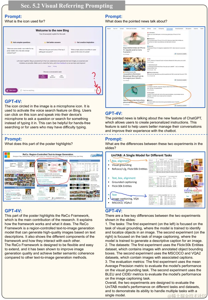 如何有效地使用和提示 GPT-4V? GPT-4V 在理解像素空间编辑方面表现出色,比如理解在图像上添加的视觉指示和场景文字。基于此,我们探讨了“视觉引用提示”方式,这是一种直接编辑输入图像以指导任务的方法。这种视觉引用提示可以轻松与其他图像和文本提示集成,为用户提供了一个细致的指示和示例演示界面。