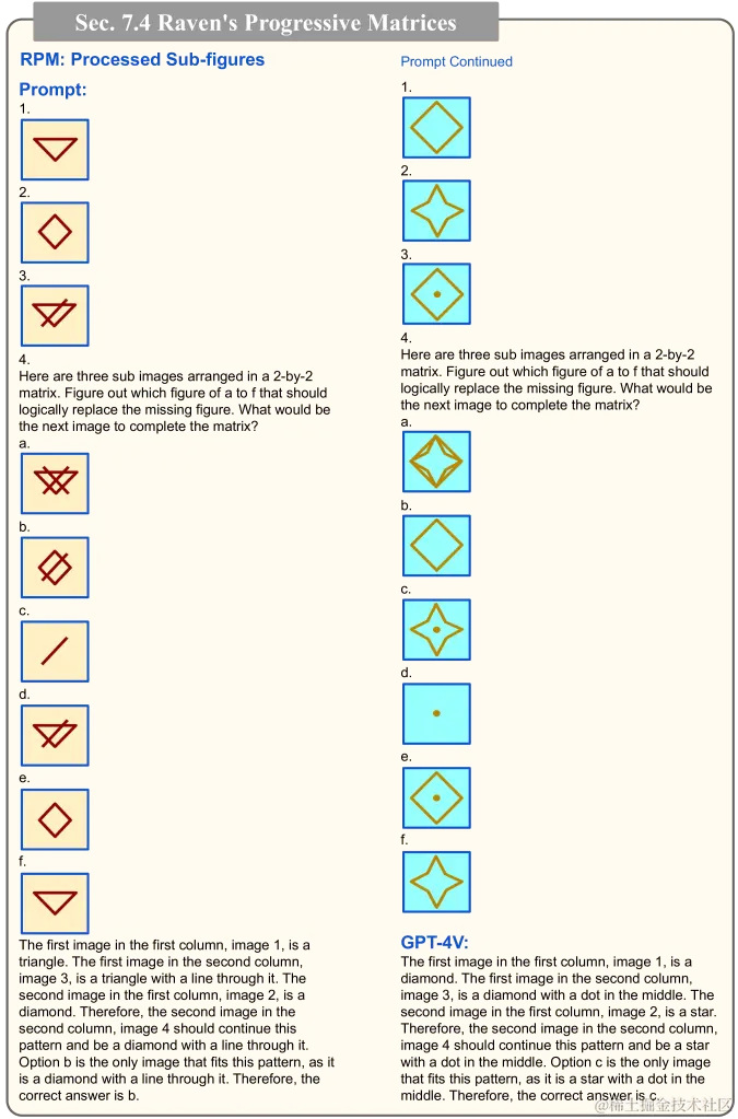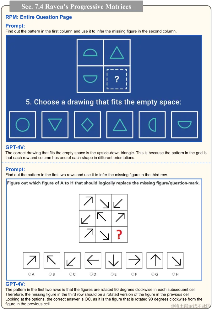 GPT-4V 不仅支持更多变的输入格式,其通用性还让任务示范变得更加直观和高效,相较于仅仅跟随指令或在特定上下文中进行少量学习的方式。Ouyang 等(2022)、Mishra 等(2022)、Wei 等(2022a)及 Sanh 等(2021)首次针对 NLP 任务提出的指令跟随技术,主要关注的是纯文本形式的任务指令,与视觉查询输入关系较远,无法清晰展示任务。相对的,在上下文少量学习方式下,Brown 等(2020)、Tsimpoukelli 等(2021)和 Alayrac 等(2022)提供了包含图像和文本的实时示例,但这些示例需要与推理查询的格式严格对齐,使用起来较为复杂和繁琐。此外,上下文示例常常与指令分开使用,模型需要推理出任务目标,这降低了示范的有效性。而 GPT-4V 能理解多模态指令,可以直接将任务示范与相关上下文示例相结合,使得任务说明更为直观和明确。例如,在图 7 中,将“寻找第一列中的模式”的指令与示范例子(如(1)中圈出的模式和(2)中的相关子图)相结合,简化了学习流程,提升了模型的表现。这一方式也更贴近人类的学习过程,将抽象指令和直观示例相结合。