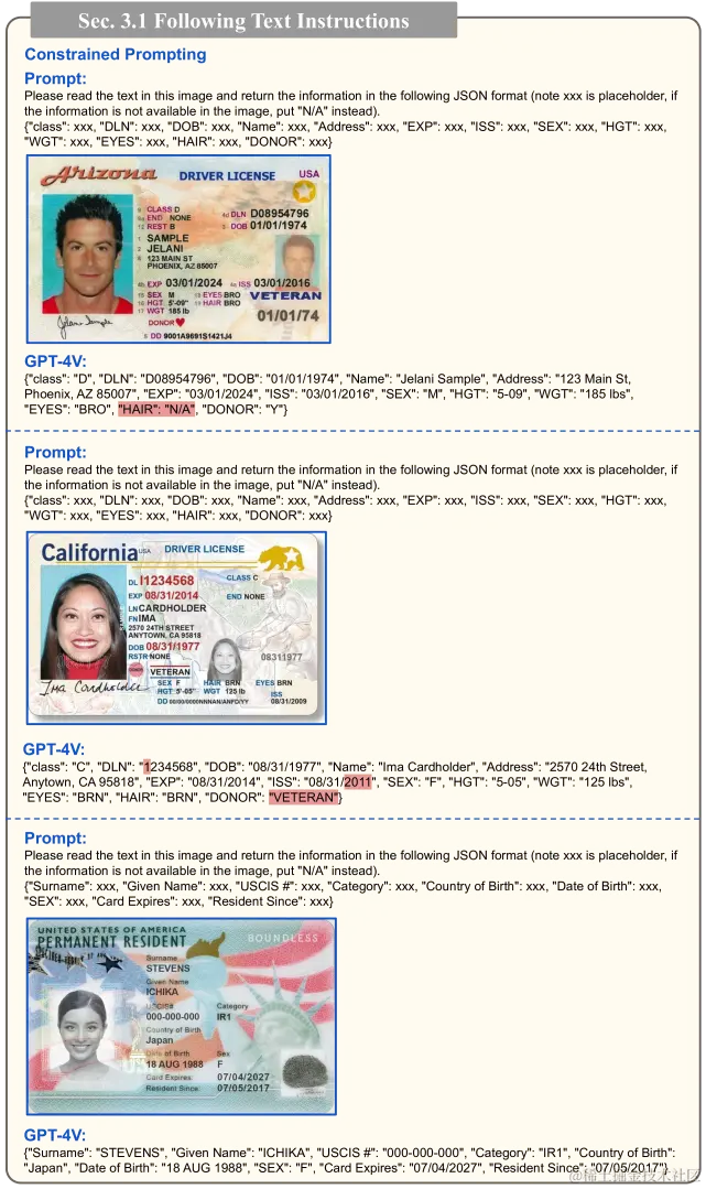 如图 3 所示,我们引导 GPT-4V 阅读图像中的文字,并按照特定的 JSON 格式返回信息。虽然 GPT-4V 在识别驾驶证上信息时出了些差错,但其回应严格遵循了文本指令中规定的 JSON 格式。在第 9 节,我们将此技巧应用于特定场景中。
