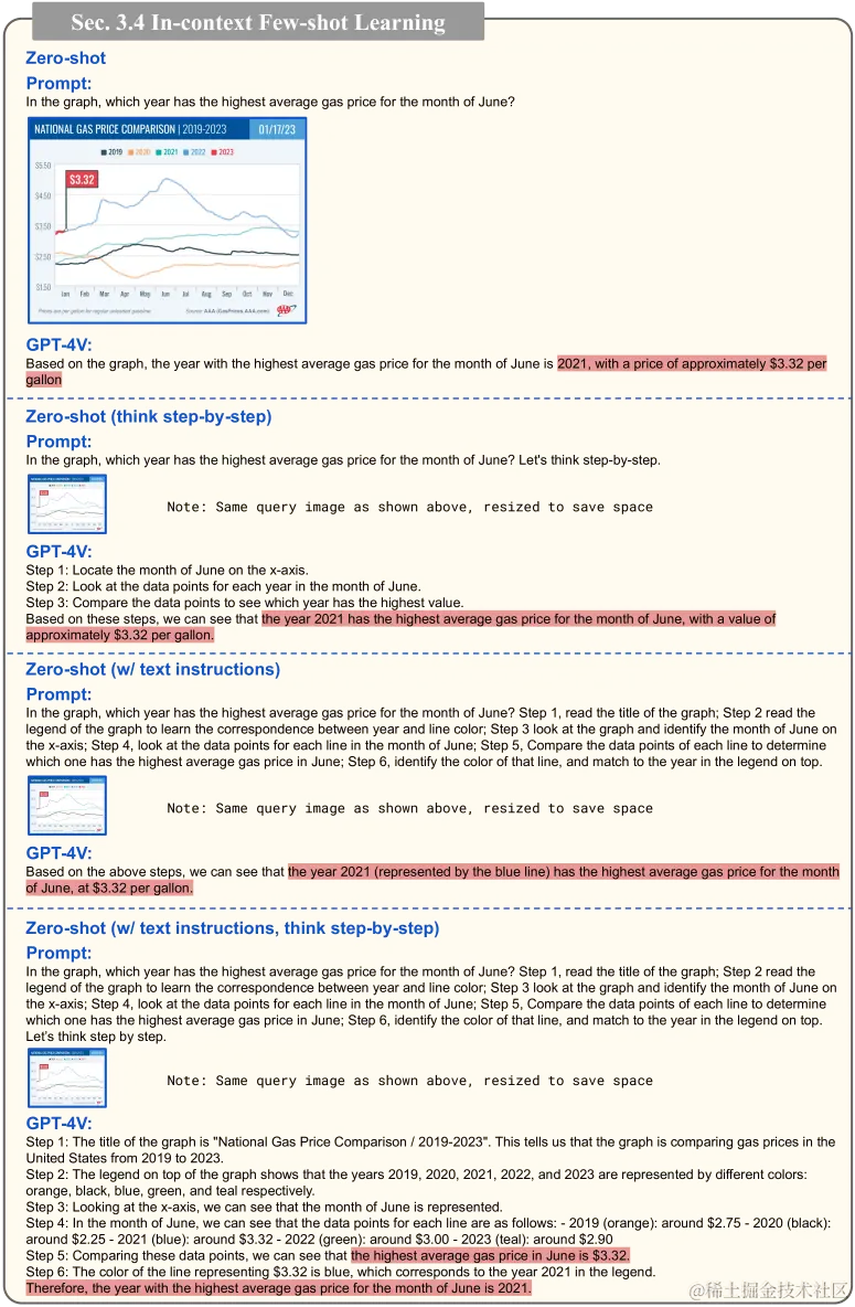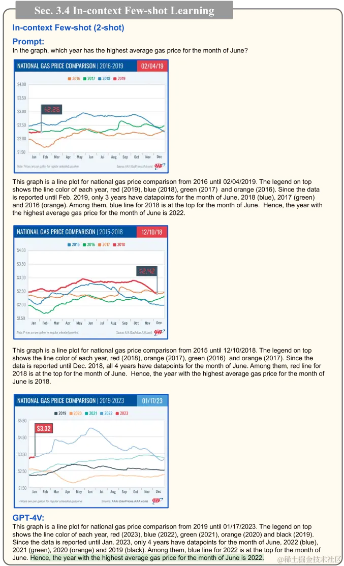 图 11-13 展示了在解读一个复杂折线图时,zero-shot、1-shot 和 2-shot 性能的对比。此例具有相当高的难度级别,因其涉及到多步推理。要回答“图中哪年六月的平均油价最高”这一问题,需要完成四个步骤:(i)在 x 轴上找到六月,(ii)比较六月中每条线的数据点,(iii)找出数值最高的线条的颜色,并(iv)将这个颜色与图例上的年份相对应。任何步骤的错误都会导致答案出错。正如 Figure 11 所展示的,即便在 zero-shot 情况下使用“文本指导,逐步思考”的提示,GPT-4V 也无法正确匹配颜色与图例中的年份。而且,它的注意力还被图中突出的 $3.32 油价吸引了过去。如 Figure 12 所示,虽然 GPT-4V 在识别图例方面有所提升(相对于 zero-shot,成功纠正了 2021 和 2022 的颜色),但它仍然错误地认为 2023 年的六月油价最高,虽然数据只覆盖到 01/17/2023。然而,当我们在 Figure 13 中加入另一个上下文示例后,GPT-4V 终于得出了正确答案(2022 年),并给出了解释其推理过程的中间步骤,这与在上下文示例中展示的情况相似。