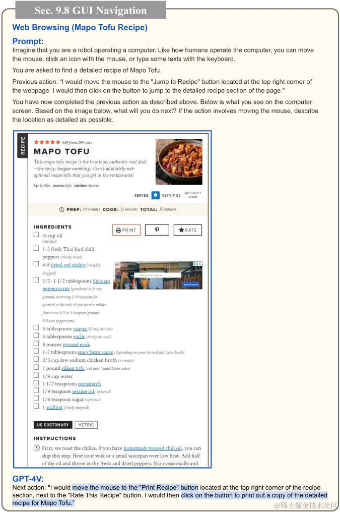 GPT-4V 利用图形用户界面(GUI)在网络上搜寻麻婆豆腐的制作食谱。在预见到将食谱打印出来之后,我们要求 GPT-4V 阅读打印食谱的截图,并进行总结。