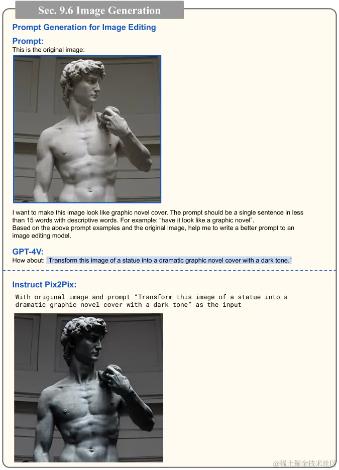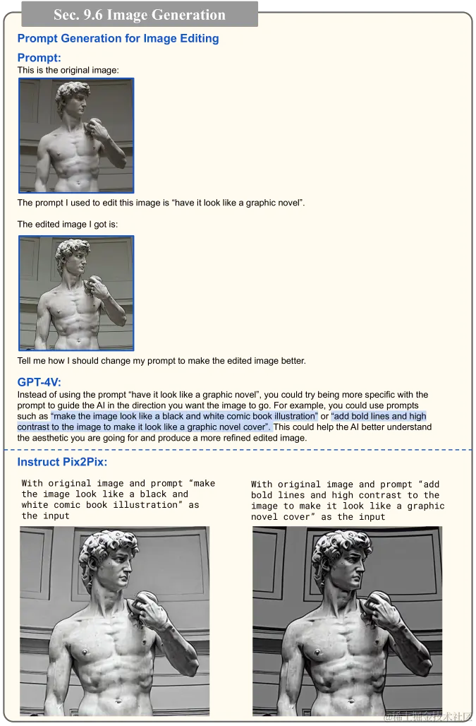 图 86:这个图片展示了在已有原始图像和文本需求的情况下,我们是如何优化图像编辑文本提示的。其中,蓝色高亮的部分是 GPT-4V 提供的建议编辑提示。原始图像和示例编辑提示取自 2023 年 Brooks 等人的 Instruct Pix2Pix。想要查看详细讨论,请参考第 9.6 节。