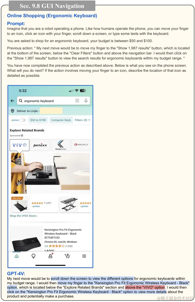 图 104:GPT-4V 利用图形界面在线选购人体工学键盘,蓝色部分强调了预期的操作。更多相关讨论,请参见第 9.8 节。