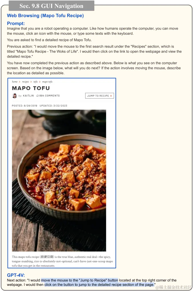 图 92:模型 GPT-4V 通过图形界面(GUI)浏览网页搜索麻婆豆腐食谱,其中蓝色部分突显了预测的操作动作。更多详细讨论请参见第 9.8 节。