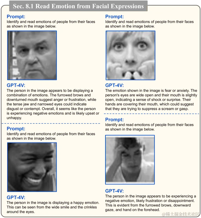 GPT-4V 在不同领域和任务上展现出了怎样的质量和通用性?报告的大部分都是探索这个问题。第 4 节进行了全面的分析,覆盖了多个视觉和视觉-语言场景,包括在不同领域的图像描述与识别、密集视觉理解、多模态知识、常识、场景文本理解和文档推理等。报告还特别提及了一些新颖和有趣的功能。第 6 节研究了 GPT-4V 在理解时间、运动和视频方面的能力。第 7 节深入了抽象视觉理解和推理能力,而第 8 节探讨了情绪和情感理解方面的能力。